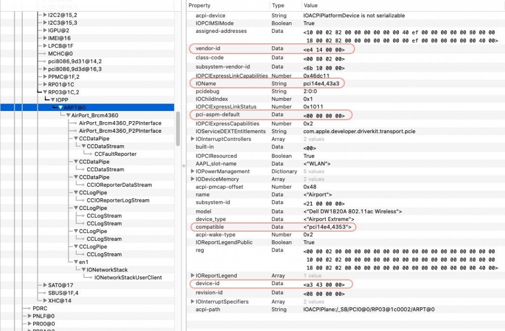 Last update: 28th Jan 2020 Dell DW1820A: Ok Ok Ok DW1820A is a pretty good combo card providing 2.4/5GHz 802.11ac wireless at 867Mbps + Bluetooth 4.1. As stated at Wikidevi, there appears to be a few different models of the card. Whilst they all carry the same Broadcom id 14e4:43a3, they each carry a different subsystem id/part #: 1028:0021 (part # CN-0VW3T3) -> 100% Ok with ASPM disabled (originally tested 100% Ok on my Latitude 7490 without ASPM tuning) 1028:0021 (part # CN-096JNT) -> 100% Ok with APSM disabled 1028:0022 (part # CN-096JNT) -> 100% Ok with APSM disabled 1028:0023 (part # CN-0VW3T3) -> 100% Ok with APSM disabled 1028:0023 (part # CN-08PKF4) -> 100% Ok with APSM disabled I acquired a Dell DW1820A a few months ago and was able to play with that card on a Latitude 7490 laptop (fitted with an M.2 2230 Key A+E WLAN slot) that I targeted for Mojave. The model I received was CN-0VW3T3. Before it was later established that not all DW1820A were equal, I purchased a 2nd one and, as it turned out to be, was lucky to receive another 0VW3T3 model. /!\ The 1st thing I want to report is that I encountered difficulties booting my Mojave USB installer and installing macOS with the card plugged in. I had to disable wireless in BIOS to be able to install Mojave. Once it was installed, booting Mojave with wireless enabled in BIOS would cause quite severe lag and performance degradation once at the desktop, as if the card just clogged up CPU ressources. This was because I had not applied any particular tuning for the card and, of course, this was resolved once I implemented the necessary fix detailed below. /!\ Searching through the Web for that DW1820A/BCM4350, I came accross a few forum posts/threads that mentionned: rolling back the Yosemite IO80211Family kext to get the card to work, although with instability and regular KPs removing AirPortBrcmNIC plugin kext from IO80211Family kext, patching AirPortBrcm4360 plugin kext with the id of the DW1820A and installing AirportBrcmFixup kext with a couple of parameters (Credits to Hugotai, cf. his post @Voldemort's place, 2nd Dec 2018) Whilst I did not really contemplate doing the 1st thing, I did envisage the 2nd one and started to look at the differences between Yosemite's version of IO80211Family kext and Mojave's. The main difference I had already noticed was that device id 14e4:43a3 was handled by AirPortBrcm4360 up to Sierra 10.12 and by AirPortBrcmNIC since High Sierra 10.13. Further reading and experimenting showed me that AirPortBrcmNIC kext was the root cause of the problem. Building on Hugotai's success, I seeked to work out an easier solution to bypassing AirPortBrcmNIC kext that would not require kext removal and Info.plist patching but, instead, something that could be implemented through hardware properties injection, either through DSDT/SSDT patching or bootloader (Clover or OpenCore) configuration. Once Hugotai's solution was verified and confirmed, I worked out the following Clover-based solution (because that's what I was using) for HighSierra/Mojave: identify the IOReg/ACPI device to which the DW1820A card is attached (use IORegistryExplorer app to that effect). Eg: RP0n@xx,yy->PXSX@0. in the absence of individual ACPI device entry under the PCI bridge for the card, select "FixAirport" ACPI Fix in Clover. That'll create a device "ARPT" @0 under the bridge and that's what you'll inject properties to. This may also require to select "AddDTGP" ACPI Clover fix if your DSDT does not possess any DTGP method. If running with Clover, use Clover Configurator app to that effect. inject the following properties either in DSDT or through bootloader config (latter recommended): compatibility of the card with Broadcom chips 14e4:4353 or 14e4:4331 that are handled by IO80211Family's PlugIn kext AirPortBrcm4360 ASPM disabling (required for most cards to avoid CPU clogging and system freeze) optionally, add SysProfiler's cosmetic info such as PCIe Slot, card's make and model, etc. and that's it ! Nothing to do to IO80211Family kext or its PlugIns which all remain untouched/unmodified/full vanilla in /S/L/E. It really could not be simpler... NB: if your card's country code absolutely requires to be changed, say for full 5GHz/80MHz operations, add the following steps: install AirportBrcmFixup kext in /L/E + repair permissions + rebuild your cache or inject it through Clover's EFI/CLOVER/kexts/Other add boot argument brcmfx-country=XX (where XX is the target value, eg: US, FR, #a, etc.) to the Boot section of your Clover config but, beware, I found that using AirportBrcmFixup (v1.1.9 at time of writing) with country code other than default's US setting of the card impacted my wireless performance (fluctuating and reduced RX/TX rate). For instance, with country code set to FR (for France), I would not connect at 80MHz on my 5GHz Wireless network, only at 40MHz which resulted in a local wireless connection limited to 400Mbps (vs. 867Mbps) and reduced my overall Internet RX rate by about 60% and TX rate by about 10%: with country code set to #a (to get full 80MHz connection), I could not obtain DFS channel mode to my local router and I noticed fluctuating/unstable RX/TX rates: without AirportBrmfixup, my wireless connection runs solid at 867Mbps and SpeedTest returns a solid TX and RX rates at 300Mbps (i.e. the maximum speed of my Internet connection). Properties injection through DSDT: On my laptop, the DW1820A was found attached to device RP03.PXSX located at IO address 0x001C0002, i.e. 1C,2. The DSDT patch required to inject properties could look like this (devices names will differ from one computer to another of course!): Device (RP03) // PCIe Root Bridge { name (_ADR, 0x001C0002) [...] [...] [...] Device (PXSX) // DW1820A card attached to this device (FixAirport Clover ACPI fix required if such device is missing) { Name (_ADR, Zero) [...] [...] [...] Method (_DSM, 4, NotSerialized) // _DSM: Device-Specific Method { If (LEqual (Arg2, Zero)) { 