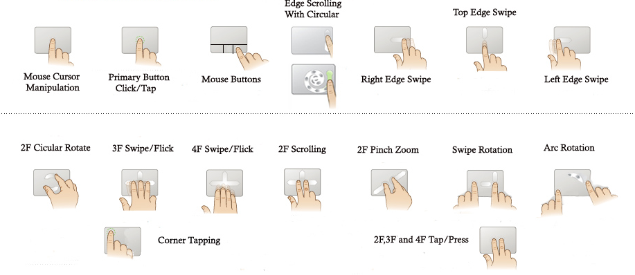 Following are the features supported by the Smart touchpad driver in Mac OSX: Mouse mode Tapping Dragging Scrolling Swipes Zoom Rotation Clicking and Fingers Press Features Toggle Accidental inputs prevention and Palm detection Apple Trackpad Prefpane support Customization of features Enhanced Keyboard support Support for Asus Keyboard backlight with Idle Auto on/off Prefpane for controlling touchpad features [coming later as its got my least prority] For full details about each feature, check out the respective posts below. Supported OS X Action values to config gestures: 0 : To disable the gesture 1 - Applications Switch 2 - App close 3 - Launchpad 4 - Mission control 5 - Dashboard 6 - Left Space/Full Screen apps switch 7 - Right Space/Full Screen apps switch 8 - Application windows 9 - Minimize app 10 - Toggle Full screen Switch 11 - Backward 12 - Forward 13 - Desktop 14 - Notification center (keyboard shortcut) 15 - Show Properties/Info 16 - Hide/Show Dock 17 - Notification center (soft mode) 18 - Zoom reset (works in Photos, Browser etc., where it supports) 19 - Finder 20 - Force Quit 21 - Right click 22 - Middle click 23 - 34 as F13 - F24 35 - Left click1 point