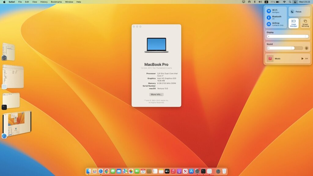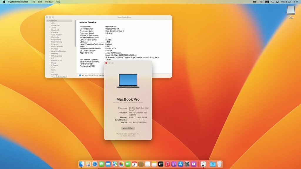 If we compare the SKL framebuffer typically used on Skylake laptops with the KBL framebuffers typically used on Kaby Lake laptops, we can see how close they are in terms of memory settings and output ports definition: ID: 19160000, STOLEN: 34 MB, FBMEM: 21 MB, VRAM: 1536 MB, Flags: 0x0000090F TOTAL STOLEN: 56 MB, TOTAL CURSOR: 1 MB (1572864 bytes), MAX STOLEN: 124 MB, MAX OVERALL: 125 MB (131608576 bytes) Model name: Intel HD Graphics SKL CRB Camellia: CamelliaDisabled (0), Freq: 1388 Hz, FreqMax: 1388 Hz Mobile: 1, PipeCount: 3, PortCount: 3, FBMemoryCount: 3 [0] busId: 0x00, pipe: 8, type: 0x00000002, flags: 0x00000098 - ConnectorLVDS [1] busId: 0x05, pipe: 9, type: 0x00000400, flags: 0x00000187 - ConnectorDP [2] busId: 0x04, pipe: 10, type: 0x00000400, flags: 0x00000187 - ConnectorDP 00000800 02000000 98000000 01050900 00040000 87010000 02040A00 00040000 87010000 KBL framebuffer 0x59160000: ID: 59160000, STOLEN: 34 MB, FBMEM: 0 bytes, VRAM: 1536 MB, Flags: 0x00000B0B TOTAL STOLEN: 35 MB, TOTAL CURSOR: 1 MB (1572864 bytes), MAX STOLEN: 103 MB, MAX OVERALL: 104 MB (109588480 bytes) Model name: Intel HD Graphics KBL CRB Camellia: CamelliaDisabled (0), Freq: 1388 Hz, FreqMax: 1388 Hz Mobile: 1, PipeCount: 3, PortCount: 3, FBMemoryCount: 3 [0] busId: 0x00, pipe: 8, type: 0x00000002, flags: 0x00000098 - ConnectorLVDS [1] busId: 0x05, pipe: 9, type: 0x00000400, flags: 0x00000187 - ConnectorDP [2] busId: 0x04, pipe: 10, type: 0x00000800, flags: 0x00000187 - ConnectorHDMI 00000800 02000000 98000000 01050900 00040000 87010000 02040A00 00080000 87010000 KBL framebuffer 0x591B0000: ID: 591B0000, STOLEN: 38 MB, FBMEM: 21 MB, VRAM: 1536 MB, Flags: 0x0000130B TOTAL STOLEN: 39 MB, TOTAL CURSOR: 1 MB (1572864 bytes), MAX STOLEN: 136 MB, MAX OVERALL: 137 MB (144191488 bytes) Model name: Intel HD Graphics KBL CRB Camellia: CamelliaDisabled (0), Freq: 1388 Hz, FreqMax: 1388 Hz Mobile: 1, PipeCount: 3, PortCount: 3, FBMemoryCount: 3 [0] busId: 0x00, pipe: 8, type: 0x00000002, flags: 0x00000098 - ConnectorLVDS [2] busId: 0x04, pipe: 10, type: 0x00000800, flags: 0x00000187 - ConnectorHDMI [3] busId: 0x06, pipe: 10, type: 0x00000400, flags: 0x00000187 - ConnectorDP 00000800 02000000 98000000 02040A00 00080000 87010000 03060A00 00040000 87010000 With KBL 0x59160000, only the FBMEM settings (21MB vs. 0MB) + 3rd port type (DP vs. HDMI) differ and, if need be, we can easily inject that through properties injection in the bootloader's config. With KBL 0x591B0000, only the external output ports definition (HDMI + DP) differ and, if need be, we can easily inject that through properties injection in the bootloader's config. I've also experimented with the SKL injector posted by PMHeart here at IM; the E7270 certainly appears to run Ventura much more stable but graphics defects are, imo, worse, especially in Safari. On the other hand, it's Ok with Chrome so I would recommend using that for the time being. Revised Clover pack #2 posted above.1 point