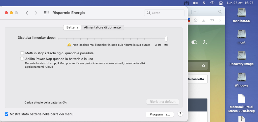 Hi everyone, as per title (and in signature), I encountered an issue when my laptop updates the bios: latest bios update was quite mandatory (due to a problem with embedded batteries). I'm able to downgrade it but, at reboot, bios starts again to update to the latest version (01.17) without any possibility to avoid the procedure and to stop it. The issue: this latest bios gives me an acpi battery error and shows me no battery at all in macOS (both 11.6 and 12.0.1 RC2). I'm not at all an expert in acpi patching so I'm here to ask you an hand. I already tried to patch it using SSDtime but with no effect. You can find as attachments the current EFI, the acpi tables extracted with OC 0.7.2 debug, ioregistry file and some screenshots (I have a video of boot verbose, if needed). Hope this can help to understand the issue (and to make you solve it). Thank you so much in advance MacBook Pro di Marco 2018.ioreg.zip EFI.zip SysReport.zip