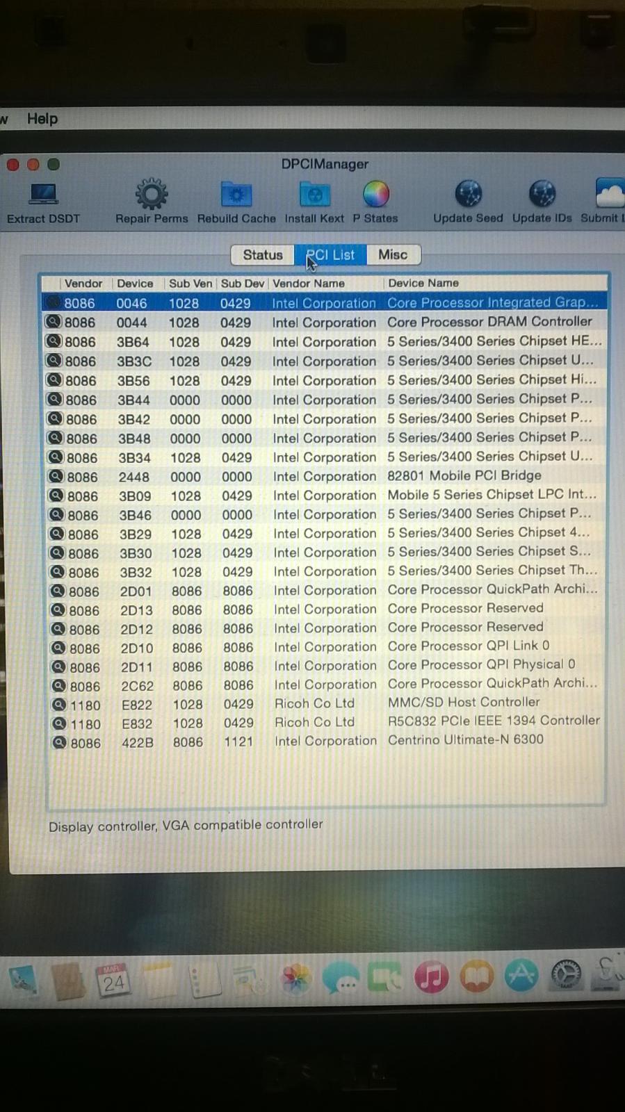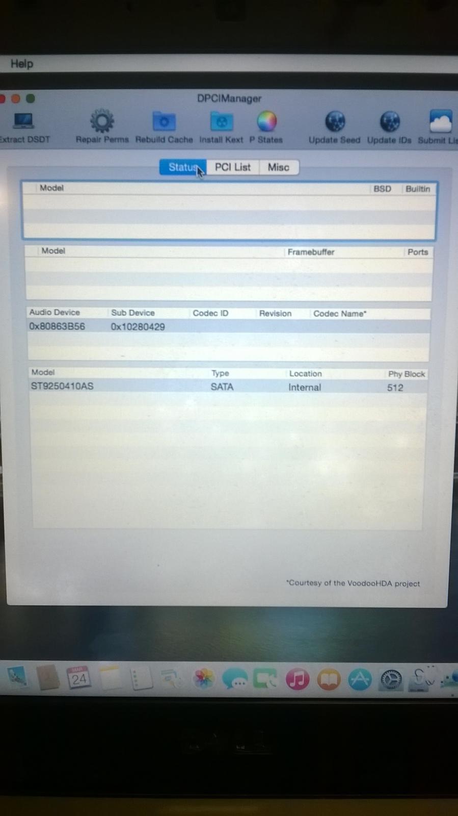 Hi guys, now I've successfully installed Mavericks 10.9 with CI, I need Help with my post-installation if you're so glad to give me some support. Wi-fi don't work but I know it(I've to change the card), Bluetooth ok, pairing works Monitor: resolution ok(1440x900) no setting in Preferences but brightness works with FNkey Touchpad works(no gesture) Keyboards ok Ethernet don't works Usb all 4 are ok VGA no Dvd works but I get error when I launch the Application (probably CI error) Audio don't works Battery, I put ACPIBattery kext in 10.9, whit Yosemite was Ok, with Mavericks NO I attach Dsdt, Config, kext in 10.9 and DpciManager Picture If you need it. I'm grateful with everyone for any help and suggestion. Using Carbo178 guide from Insanely to create the Usb and Clover latest version Bootloader DSDT.aml.zip config.plist.zip 10.9.zip
