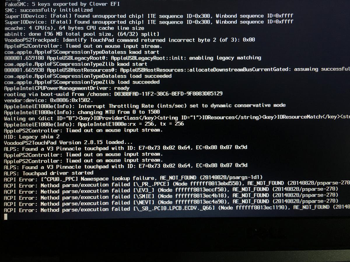9. Hello, this is my first topic in this forum and i hope, some one could help me with my first hackingtosh steps with my new Dell Laptop. I have no more ideas, why the installation hangs or stops after selecting the installation partition. But at first, i used this perfect article to create an usb stick for installation: https://osxlatitude.com/index.php?/topic/9383-dell-e6220-i7-2620m-clover-detailed-guide/ Also used the recommend BIOS Setting from the linked Site in the guide above. After the first errors, like a kernel panic, i´ve found a suitable SSDT.AML for my processor. And now the kernel panic is solved but the Laptop stops now with a black screen with a single crossed white circle. I´ve attached a screenshot from the Window. I hope, that someone could help me with this issue.