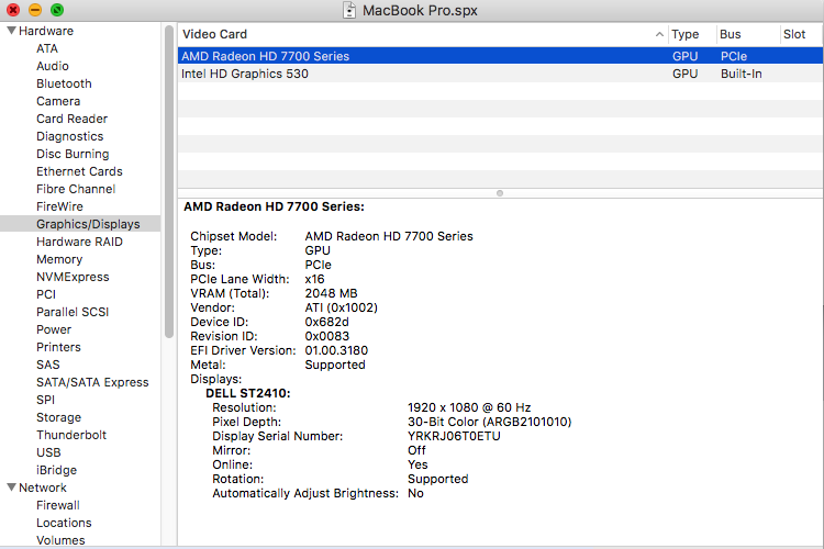 hello, my 7510 running almost ok with 10.12.4, had connected with Firepro graphics card like this, but I could not connect with seccond displays to HDMI or mDP.