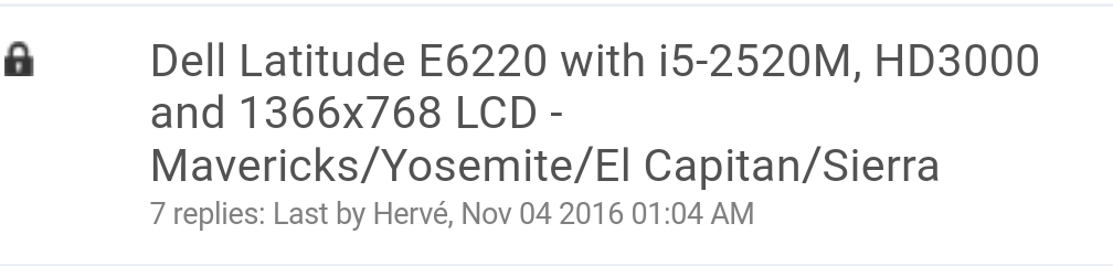 Hi everyone i apologize for my bad English, i have installed sierra on my latitude e6420 i5 1366x768 everything works perfectly except the external hdmi port, if i connect the cable the tv becomes all white and i just use the Dell Latitude E6220 with I5-2520M, HD3000 and 1366x768 LCD - Mavericks / Yosemite / El Capitan / Sierra I reinstalled 2 times all but without results I tried the kext patch but nothing I tried various dsdt but nothing. At startup I noticed 3 kext mistakes with this message: