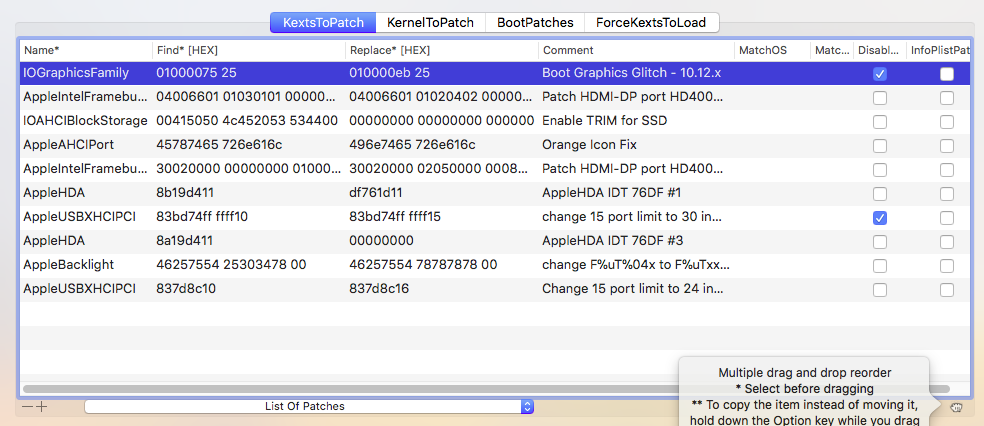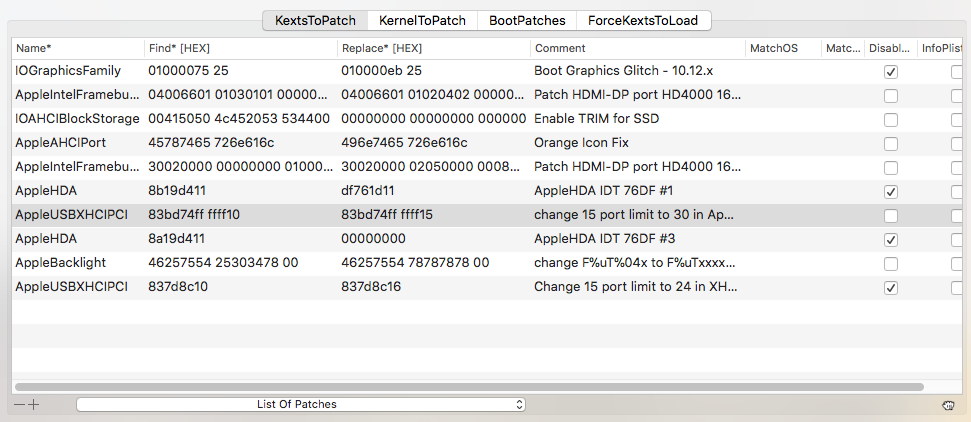 With regards to USB, I've applied the patches and deleted GenericUSBXHCI from my EFI partition, but again only the corner USB port is recognised. Here are my ACPI patches and Kernel Patches