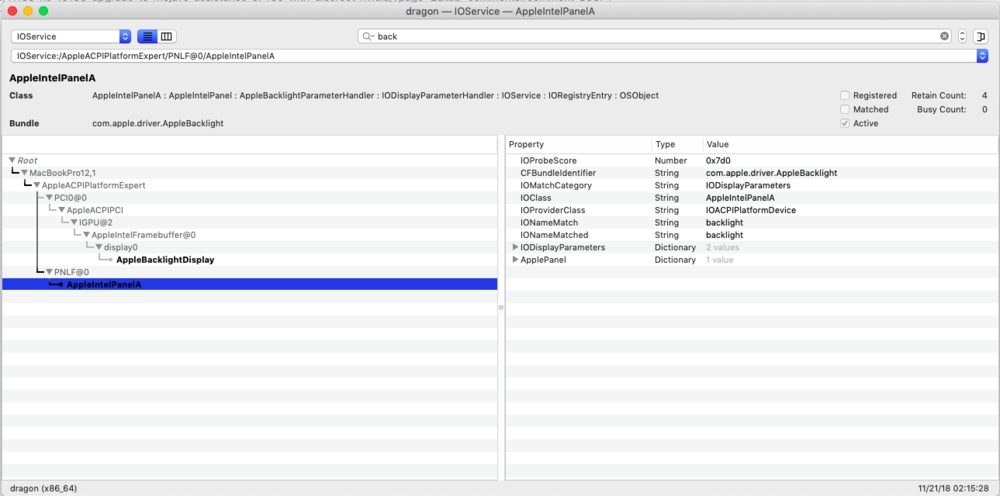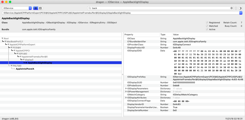 I have 16 different brightness levels (I counted changes with F12 from complete black). From complete black to fully 100% bright. I do not see any difference compared to AppleBacklightInjector.kext + F%uT%04x -> F%uTxxxx. Based on everything I read, this should not work, but somehow it does. To complete this mystery AppleBacklightFixup doesn't work at all. EDIT: I am sure that I do not have active AppleBacklightFixup.kext nor AppleBacklightInjector.kext with patch rebuilding //System/Library/PrelinkedKernels/prelinkedkernel kext file:///Library/Extensions/DisableTurboBoostBattery.kext/ is in hash exception list, allowing to load Kext with invalid signatured (-67062) allowed: <OSKext 0x7f9038713630 [0x7fffa841b8f0]> { URL = "vkgLegacySierraQMI.kext/ -- file:///Library/Extensions/", ID = "com.apple.driver.vkgLegacySierraQMI" } KernelCache ID: 5FD429B0B475017C20F69DA3F5CCC0B2 kextcache updated critical boot files, requesting launchd reboot ioreg -