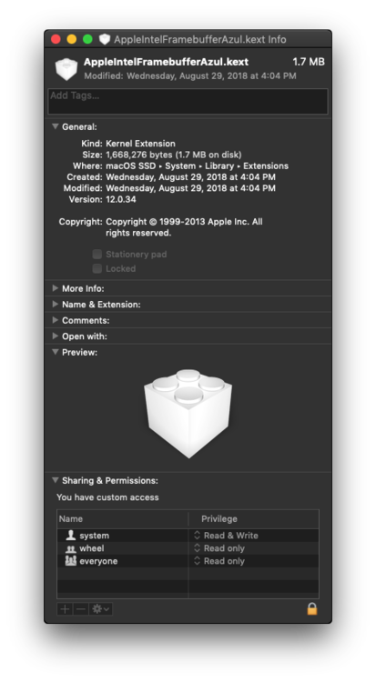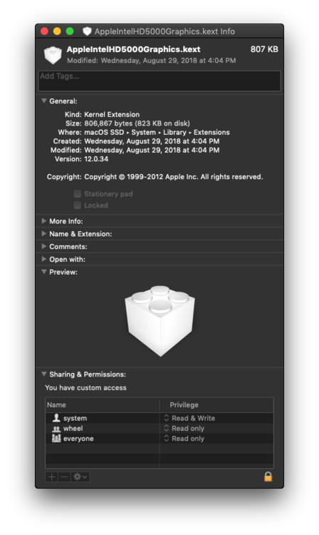 All right It successfully but no acceleration and macOS reported "Display 7MB" on About Mac. Intel HD 5000 graphics kext are not loaded unlike WhateverGreen kext made it loaded. I changed Clover config you suggested. I added FakePCIID_Intel_HD_Graphics kext and removed AppleBacklightFixup and WhateverGreen. I kept lilu for AppleALC kext. Did I miss something? Edit: Which did you saw EFI pack? On debug_32479.zip, E7440_Mojave.zip or E7x40_Mojave.zip?