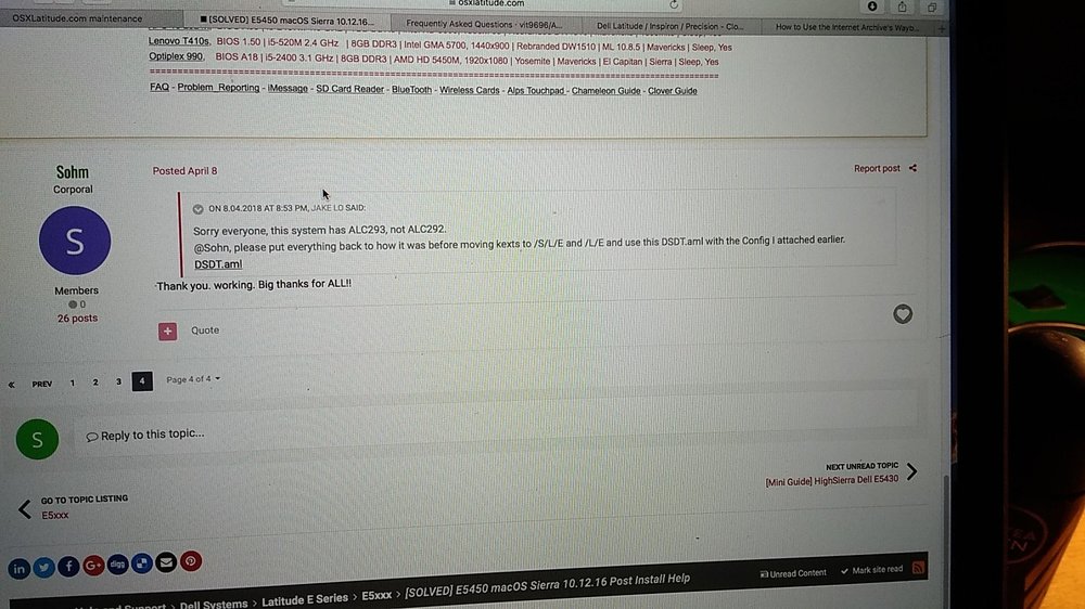 1. Hello again. Before the site maintenance I read this topic: https://osxlatitude.com/topic/10537-e5450-macos-sierra-101216-post-install-help/ I wanted to get sound working. Unfortunately it got partially deleted - I definitely saw that there were 4 pages, now there's only one. I took a photo to begin working on it, but didn't manage to download the files in time. NB: I got the sound working with VoodooHDA