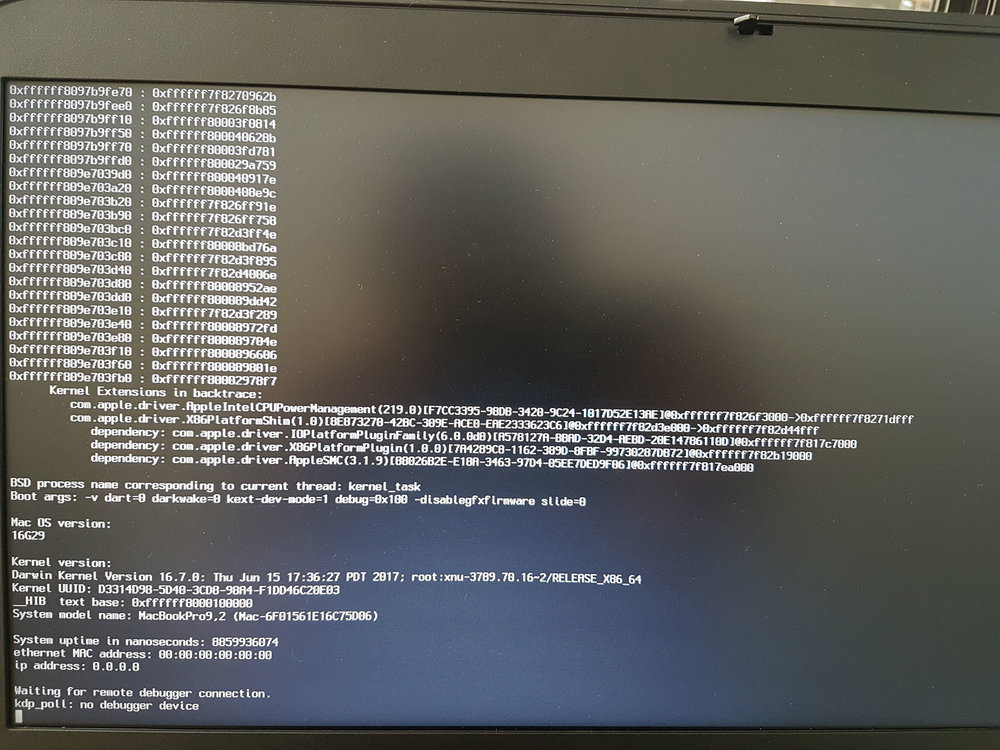 E5430 Sierra 10.12.6 Install - Some Remaining IssuesAmoxitine replied to Amoxitine's topic in The Archive Hi Jake, Many thanks for getting back to me. I followed your instructions to the letter but unfortunately this updated config doesn’t boot for me and gets stuck showing this… Some things to note when I did the changes you suggested :- 1) When I copied over the three kexts in the ‘MoveToLe’ folder to /Library/Extensions I got ’System extension cannot be used… “….kext” was installed improperly’ warnings for each (is that to be expected?) 2) When I repaired permissions and flushed the cache the first time I noticed that Terminal came back with… rebuilding //System/Library/PrelinkedKernels/prelinkedkernel kext-dev-mode allowing invalid signature -67062 0xFFFFFFFFFFFEFA0A for kext FakePCIID_XHCIMux.kext kext-dev-mode allowing invalid signature -67062 0xFFFFFFFFFFFEFA0A for kext FakePCIID.kext kext file:///Library/Extensions/DisableTurboBoostBattery.kext/ is in hash exception list, allowing to load kext-dev-mode allowing invalid signature -67062 0xFFFFFFFFFFFEFA0A for kext DirectHW.kext kext-dev-mode allowing invalid signature -67062 0xFFFFFFFFFFFEFA0A for kext CodecCommander.kext kext-dev-mode allowing invalid signature -67062 0xFFFFFFFFFFFEFA0A for kext AppleBacklightInjector.kext kext-dev-mode allowing invalid signature -67062 0xFFFFFFFFFFFEFA0A for kext BTFirmwareUploader.kext kext-dev-mode allowing invalid signature -67062 0xFFFFFFFFFFFEFA0A for kext BCM5722D.kext KernelCache ID: BBC7FB702800D47D378E17B848EE6396 File at path '/System/Library/PrelinkedKernels/prelinkedkernel' changed, cannot be used Child process /usr/sbin/kextcache[573] exited with status 77. Error 107 rebuilding /System/Library/PrelinkedKernels/prelinkedkernel So I changed the permissions on prelinkedkernal to read & write and then it seemed to run through without the same warnings, but another reboot was unsuccessful. Would any of that have a bearing on why it’s not booting? Also would the fact I’m running 10.12.6 have any bearing on things and that I would need to run an older version of Sierra such as 10.12.3 for those kexts to work? I’ve managed to boot back into my Dell via USB and I have run a new debug (not sure if the USB boot would affect things but have done it just in case you would need this) Cheers, Dave debug_8041.zip