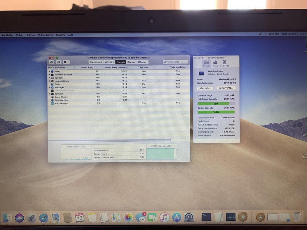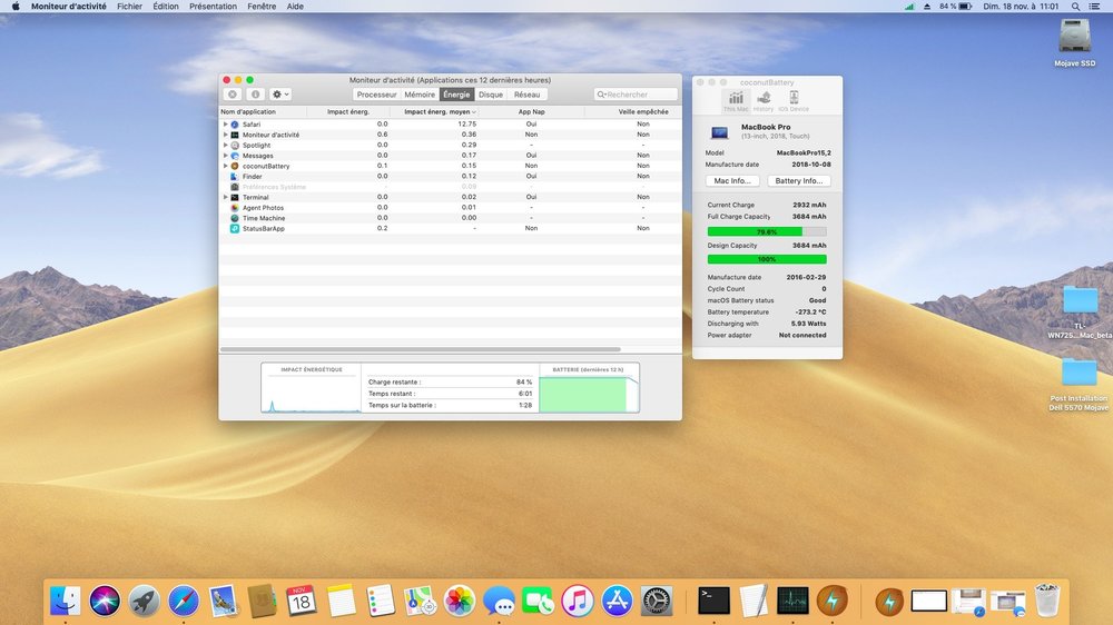 Kostas54 said: "There are 2 problems , first battery readings from activity monitor are inaccurate (compared to bios,ioreg and coconut battery). Second problem is that brightness doesn't autmatically change when connect/disconnect power cord." @Kostas54: When I unplug the power cord, the brightness automatically change on my laptop. When the brightness in the room decrease, Mojave automatically adapts desktop's colors and luminosity. -