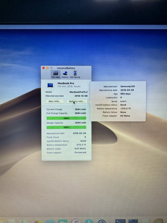 Here is a full screenshot. The values (for me) are the same but maybe I don't watch what I should. The only problem I see is the battery temperature sensor (-273,3°C !) It is the temperature of the N2 liquid (Nitrogen) Excuse me for the size of the picture. It comes from my iPhone via iMessage because I've tried to make a screenshot with the keyboard shortcuts but I can't find how to do this (I don't know where is this command ⌘) Grég Edit: OK, I've found how to make screenshots with my keyboard shortcuts (I had to redefine key in Preference System) -