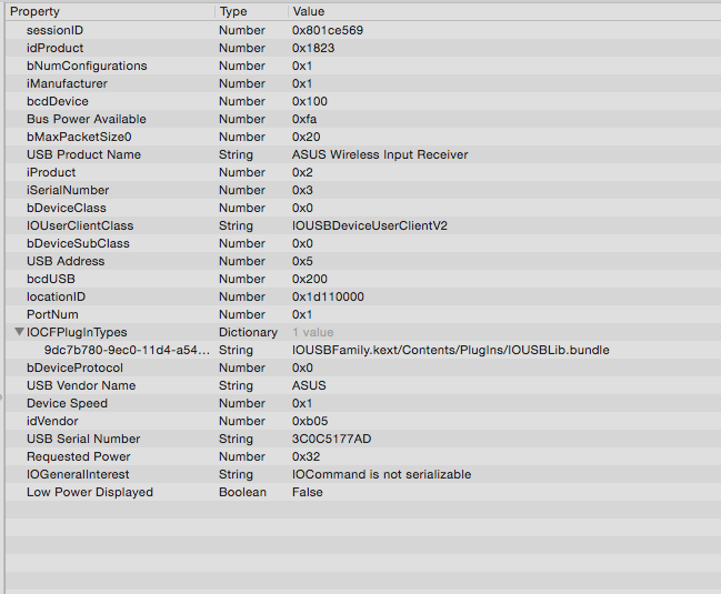 Thank you so much for the lesson that is making me! I think I have to decode my PID in the exact number to be entered. Is that right? I have also used USB Probe, but do not understand how to see the forest between all the trees. I ask a further indication .... Full Speed ​​device @ 5 (0x1D110000): ......................................... .... Composite device "ASUS Wireless Receiver Input" Port Information: 0x0018 Not Captive External Device Connected Enabled Number Of Endpoints (includes EP0): Total Endpoints for Configuration 1 (current): 4 Device Descriptor Descriptor Version Number: 0x0200 Device Class: 0 (Composite) Device Subclass: 0 Device Protocol: 0 Device MaxPacketSize: 32 Device VendorID / ProductID: 0x0B05 / 0x1823 (ASUSTek Computer Inc.) Device Version Number: 0x0100 Number of Configurations: 1 Manufacturer String: 1 "ASUS" Product String: 2 "ASUS Wireless Receiver Input" Serial Number String: 3 "3C0C5177AD" Configuration Descriptor (current config) Length (and contents): 84 Raw Descriptor (hex) 0000: 09 02 54 00 03 01 00 A0 32 09 04 00 00 01 03 01 Raw Descriptor (hex) 0010: 01 00 09 21 11 01 00 01 22 C1 00 07 05 81 03 0A Raw Descriptor (hex) 0020: 00 0A 09 04 01 00 01 03 01 02 00 09 21 11 01 00 Raw Descriptor (hex) 0030: 01 A5 22 00 07 05 82 03 0A 00 02 09 04 02 00 01 Raw Descriptor (hex) 0040: 03 00 00 00 09 21 11 01 00 01 22 17 00 07 05 83 Raw Descriptor (hex) 0050: 03 20 00 02 Number of Interfaces: 3 Configuration Value: 1 Attributes: 0xA0 (bus-powered, remote wakeup) MaxPower: 100m Interface # 0 - HID / Boot Interface