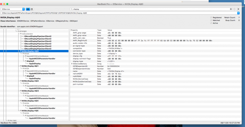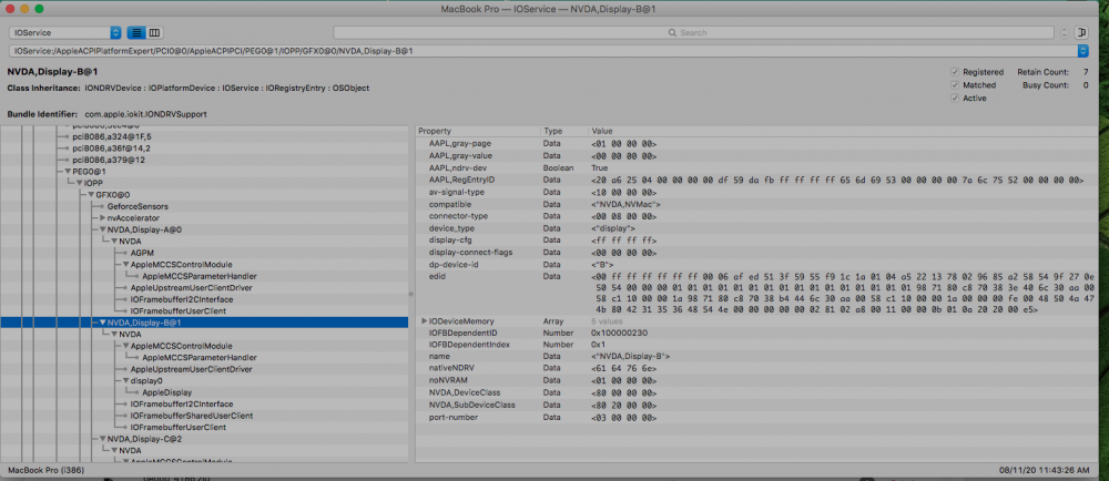 Hello Guys, I have a new setup with HS on my Alienware, not sure how many things don't work, most of them do. One of the things that doesn't work though is BRIGHTNESS control. I have a GSYNC panel on my laptop which is directly linked to the NVIDIA GPU and the intel GPU is not in use or cannot be switched ON unless someone is using a USB-C port to connect as intel is hardwired to that port. So basically i know I have to patch my brightness control but i'm a little confused as to how to. Here is the info that i have: my dGPU was named PEGP at PEG0 and i renamed it and then the IGPU was GFX which i changed to IGPU from the DSDT clover patch. Now if i look at my DSDT the _DSM method is not there and its there in the SSDT4peg0, I think (not completely sure, but 99% yes). Now the present names in the IOREG are: IOService:/AppleACPIPlatformExpert/PCI0@0/AppleACPIPCI/IGPU@2. >>>>>>> Intel GPU (IGPU@2) and IOService:/AppleACPIPlatformExpert/PCI0@0/AppleACPIPCI/PEG0@1/IOPP/GFX0@0. >>>> Nvidia(GFX@0 on PEG0) i'm still learning stuff so apologies in advance if there is info which is missing. I'm just trying to understand as to what is the logic that goes in this and should be able to patch my SSDT's, can you help on this please? Thanks in advance and please find my problem reporting files and IOreg screenshot attached. debug_4186.zip