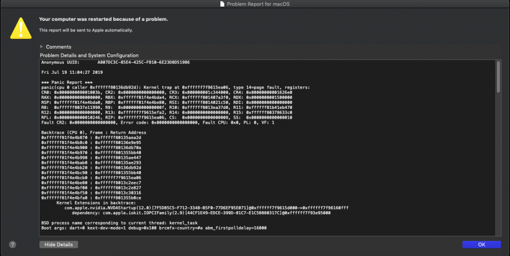 Thanks for looking at that. I tried F11 at Clover again, in addition to removing the CMOS battery (this reset all the BIOS settings to default), yet the issue persists. Even right after the CMOS has been cleared, as soon as I select the Mojave partition in Clover I get the "This computer was restarted" error message. Then when I'm logged on I get the dialogs to look at the report. Is it possible and advisable to remove com.apple.NVDAStartup?