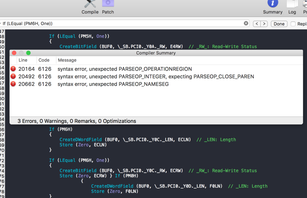 Hi Jack, I applied your fix, the error seems to be remaining: If (LEqual (PM6H, One)) { CreateBitField (BUF0, \_SB.PCI0._Y0C._RW, ECRW) // _RW_: Read-Write Status Store (Zero, ECRW (If (PM0H) { CreateDWordField (BUF0, \_SB.PCI0._Y0D._LEN, F0LN) // _LEN: Length Store (Zero, F0LN) })) } --> If (LEqual (PM6H, One)) { CreateBitField (BUF0, \_SB.PCI0._Y0C._RW, ECRW) // _RW_: Read-Write Status Store (Zero, ECRW) } If (PM0H) { CreateDWordField (BUF0, \_SB.PCI0._Y0D._LEN, F0LN) // _LEN: Length Store (Zero, F0LN) } File: DSDT.dsl -
