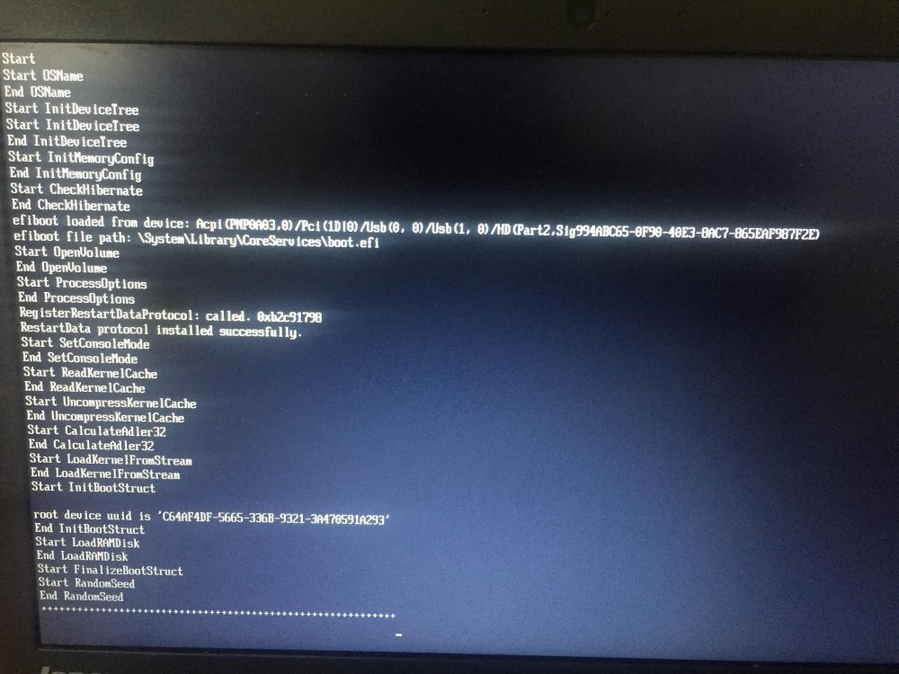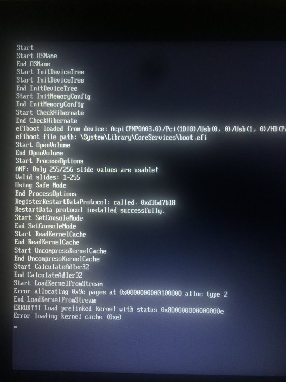 Hi, I tried it. It now automatically restarts when it reaches the "end randomseed" with plus signs but when I put "-x" on the boot args it says this: (included the efi file just in case)