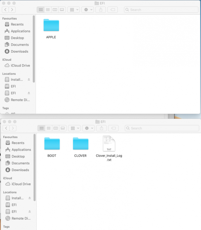 4. I have (for now) successfully in stalled Mojave on my Dell Precision T1650. I downloaded clover configurator to copy clover folder to the Mac EFI folder. But the folders look very different. Should I copy both boot and clover folder? See attached screen grab. Mac EFI folder on top and USB on bottom