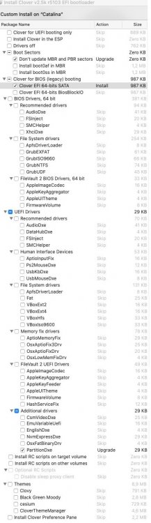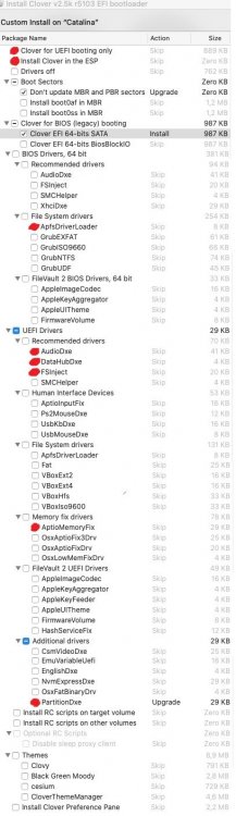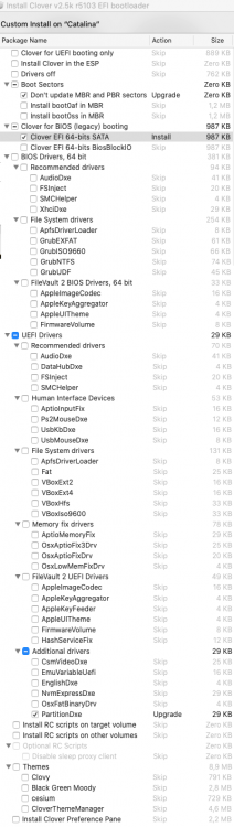 5. So I must chose: Install for UEFI booting only Install Clover in the ESP UEFI Drivers\Recommended Drivers ApfsDriverLoader AptioMemoryFix AudioDxe DataHubDxe FSInject HFSPlus SMCHelper (leave off if you have VirtualSMC.kext in bootpack) Additional drivers PartitionDxe Themes (Optional) nothing else from: Recommended driver (AudioDxe, FSInject, SMCHelper, XhciDxe) FileValut 2 BIOS Drivers 64 bit (AppleImageCodec, AppleKeyAggregator, AppleUITheme, FirmwareVolume) Human Interface Devices (AptioInputFix, Ps2MouseDxe, UsbKbDxe, UsbMosueDxe) File System drivers (ApfsDriverLoader, Fat, VBoxExt2, VBoxExt4, VBoxHfs, VBoxIso9600) FileValut 2 UEFI Drivers (AppleImageCodec, AppleKeyAggregator, AppleKeyFeeder, AppleUITheme, FirmwareVolume, HashServiceFix) Like on picture, is it ok?