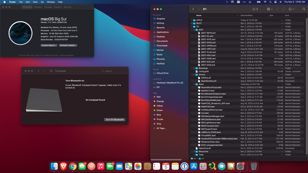 Everything Seems to be working almost! (Thanks to @acquarius.13@Jake Lo@Hervé..) - The laptop's Trackpad itself and also the Gestures stopped working when updating to Big Sur I uploaded my EFI folder below Because i want the Trackpad working with all the mac gestures, instead of TrackStick usability, I am using this: VoodooPS2Controller-R6Bronxteck.kext: https://osxlatitude.com/forums/topic/8285-refined-alps-touchpad-driver/ Instead of ApplePS2Controller, or this: VoodooPS2: https://github.com/acidanthera/VoodooPS2/releases I updated to the newest version of OpenCore from here: https://github.com/acidanthera/OpenCorePkg/releases I downloaded the Newest Versions of Kexts, and replaced the old ones before the upgrade (from Catalina): Lilu: https://github.com/acidanthera/Lilu/releases WhateverGreen: https://github.com/acidanthera/WhateverGreen/releases VirtualSMC: https://github.com/acidanthera/VirtualSMC AppleALC: https://github.com/acidanthera/AppleALC/releases AirportBrcmFixup: https://github.com/acidanthera/AirportBrcmFixup/releases E7450 OC EFI Backup - OpenCore0.6.3 (Change SN, UUID, MBSN & ROM).zip