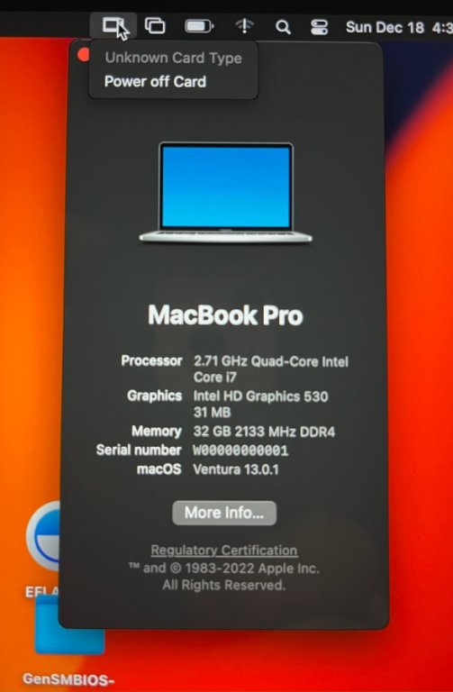 The display resolution is 61-Inch 3840 x 2160) Maybe because it's a 4k Touchscreen or something. I don't really know why. I used OCC v2.62.1.0 to add the -igfxvesa boot arg. At first i replaced -igfxmpc, but added it back later. I'm guessing I should keep -igfxmpc also? Maybe i should try another install with both flags? So, Ventura ended up Installing, but i had to force restart like 3 times during installation. Either because it was stuck or kernel panic. When it actually booted into MacOS Ventura, the Graphic Acceleration and Wi-fi wasn't working. (It's super laggy when loading Launchpad, etc). The Touchscreen works though!! Wasn't expecting that! I had to turn the display down from 2160 as the default! wowza, everything was so small. Also, tried doing all the Post-Install stuff, and during the ComboJack Install, the last step, when typing "sudo ./install.sh" it said "unknown command". I even switched the terminal to bash from zsh. I was pointing to the install file (was in the folder on terminal), so i'm not sure why that didn't work. And i also have to wait to use genSMBIOS for when i get internet, and i don't have an usb-c ethernet dongle yet. Was going to do that part when i get wifi working. How do you suppose i can fix the wifi and graphic acceleration issue? Maybe try the install again? I was under impression Intel wifi cards work out of box now. Thank you! -