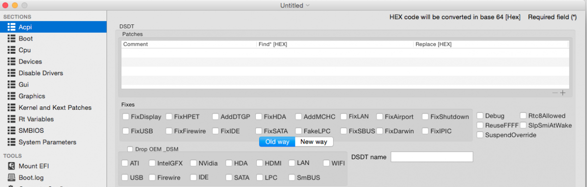 There are 2 ways to do this, modify the config.plist with a text editor which I mentioned or use Clover Configuration. Either way, you need to mount the hidden EFI partition. To do it with CC, select mount, enter your password. Click on file to open/import -> point to the config.plist in EFI/Clover directory. Once file is loaded, on the left, click on Kernel and Kext Patches, then in the middle of the window, click on the + sign to add a new patch Enter info as highlighted below. When finish, click on file, save/export