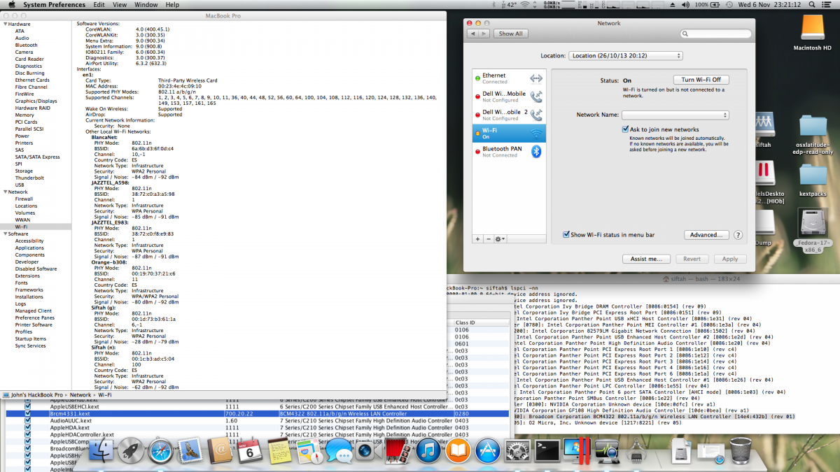 6. Help! I've almost got my 10.9 installation working like a charm on my E6530. Even the trackpad and keyboard and working, but even after replacing the original Intel Wireless with a DW1510 I purchased off eBay I've not been able to get the wireless working. System profiler can see networks and it looks like the drivers for the card are installed and working, but trying to get it to choose a network fails every time. The menu bar icon causes a beach-ball whenever clicked on and the System:Network prefpane won't let me choose a network (drop down is greyed out). Screenshots attached showing pretty much all relevant screens. I've rolled back airportd and I've also tried the work-around where you go via "Assist me..." to select the network, but that always results in my wireless password being refused (despite definitely being correct). I'm a bit at a loss. I've tried using MyHack to rebuild the kernel caches etc. Hasn't helped. My next step is to try and re-brand the card with an Apple device id, but I'm also struggling to get the card to rebrand, basically when I do the `find /sys/devices -name ssb_sprom` step there's no results returned. It isn't due to multiple entries either, there's just no results. I'm not sure whether this is related or not at the moment... I'm at the hair pulling out stage, so any advice or tips on what to check next would be gratefully received!