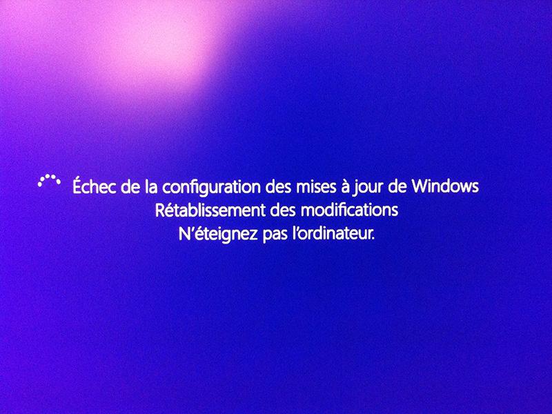 I finally took the opportunity of the Windows 8 launch to polish my dual boot installation. The only thing I had to do to be able to choose OS X or Windows 8 at boot was to boot once using a myHack USB disk, then manually reinstall Chameleon on the harddrive. After that I get Chameleon on boot and both OS X and Windows 8 boot fine from there. But, unfortunately, first automatic updates of Windows 8 broke everything. After running Windows 8 for some time, it downloaded updates automatically (which is something I'd like to keep enabled) and installed them during the next shut down. Windows 8 still starts its boot sequence, but displays an error message which would be translated to something like: "Windows updates configuration failed. Restoring changes. Don't shutdown the computer." After sometime the computer reboots and if I choose Windows 8 again, it does this indefinitely. Any idea what's wrong? And how to fix it? I already tried to reinstall Windows 8, as there wasn't anything essential installed or stored, but the same happened again.