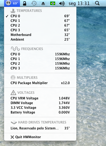 Asus Rampage II Gene - Revision 1 - BIOS version 1701leomenassun replied to SubStandard's topic in The Archive I guess it's because we have different revisions (1405 and 1701). I'll check it with Asus Support later. Removed. Everything is fine. Thanks for warning me! Ok. Done. My pic is attached. I've noticed that my LCD Poster (do you still have yours?) shows me one temperature (62ºC) and HWMonitor shows me another (68ºC - higher!) - by the way with P and CStates set back into org.chameleon.boot.plist. (Sorry, but I had to change it again in order for the temperature not getting stuck on 83ºC). Well, I've tried once again to download more developer tools, this time entering my free Apple ID. But it was necessary to answer a query in order to mach it with Apple's developer area website. So, I decided not to go ahead. Sorry, I really don't want to match my free Apple ID with Developer Site. I'm not a developer and I'm afraid to do this! hahaha So, if you don't mind attaching the correct app so that I can check my P-State, please do it. Otherwise, let's forget about checking it. :/ I am very thankful for your help and attention, Nick! Cheers!