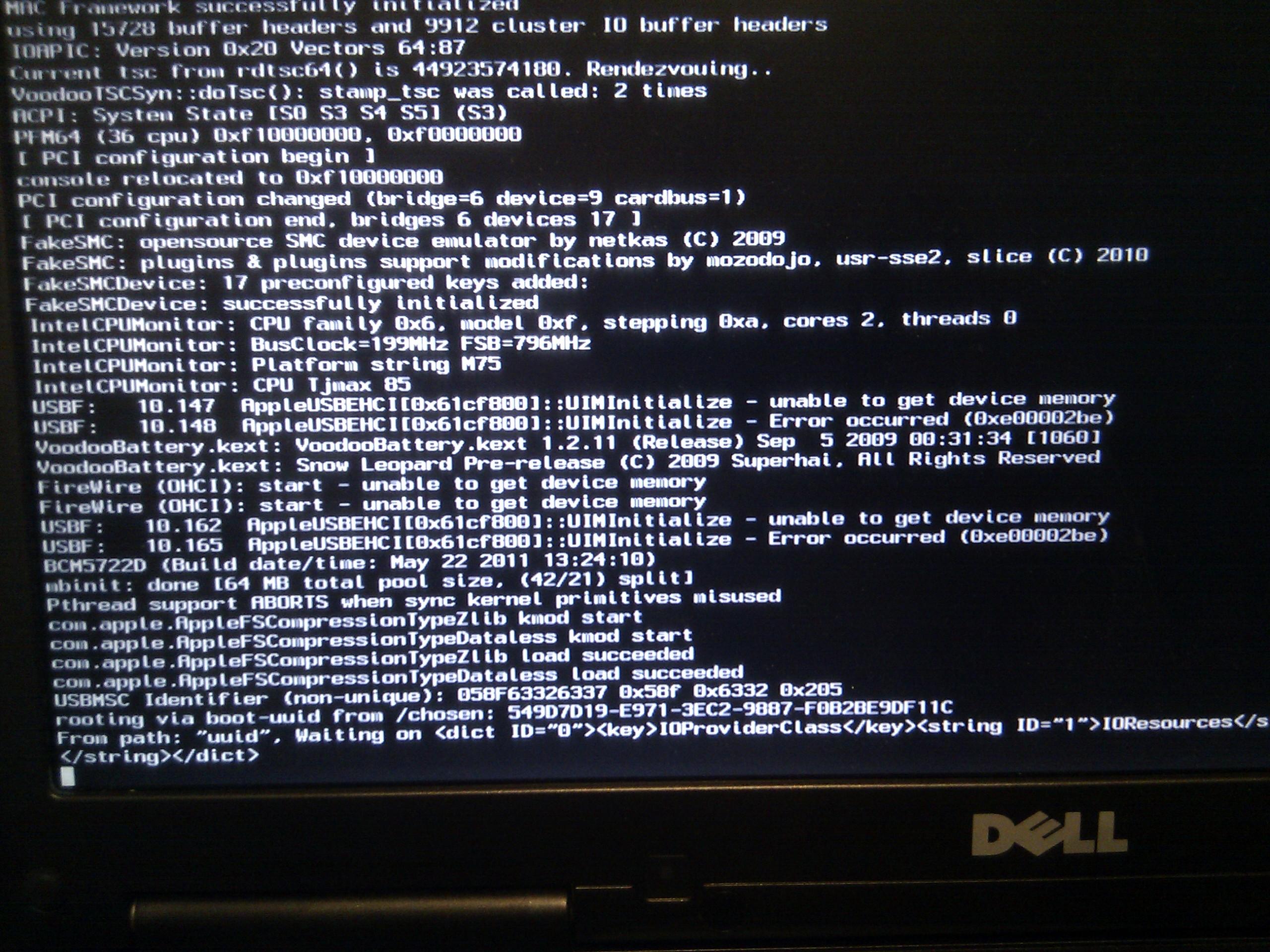 Hello @all, finally i got lion fresh installed (with usb pen and the intel 2 (1920x1080) bootpack). My D830 Resolution (1680x1050) is automatically choosed and looks great. Because the touchpad is not working (same with onboard LAN and WIFI) i wanted to install the correct kexts via the EDP tool. Therefore i ran the EDP Tool and installed the kexts for the Intel 1920x1080 with Apple Ps2 and everything else turned on. At reboot, it stucks at VoodooBAttery.kext: VoodooBattery.kext 1.2.11 (Release) Sep 5 2009 00:31:34 [1060] VoodooBAttery.kext: Snow Leopard Pre-release © 2009 Superhai. All Rights Reserved Booting with -v -x options, it stucks here: VoodooBAttery.kext: VoodooBattery.kext 1.2.11 (Release) Sep 5 2009 00:31:34 [1060] VoodooBAttery.kext: Snow Leopard Pre-release © 2009 Superhai. All Rights Reserved BCM5722D (Build date/time: May 22 2011 13:24:10) Firewire runtime power conservation disabled. (2) Firewire (OHCI) Vendor ID 1217 ID f7 PCI now active, GUID 4a4fc00023839870; max speed s400 How can I get my system booting again? Please help... Thank you...