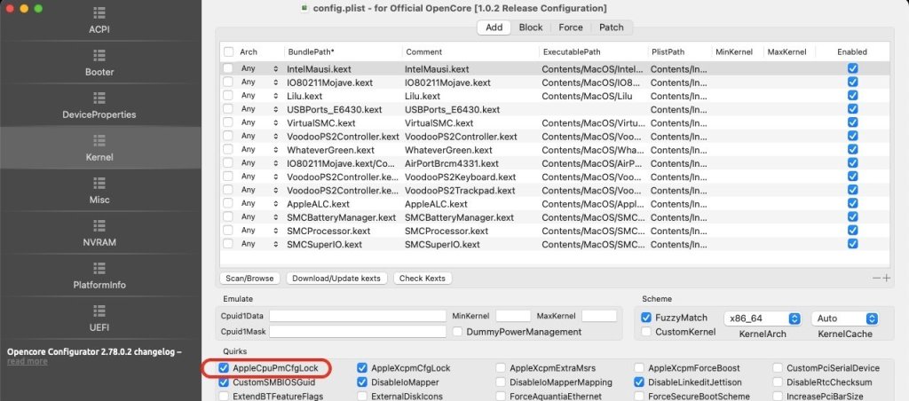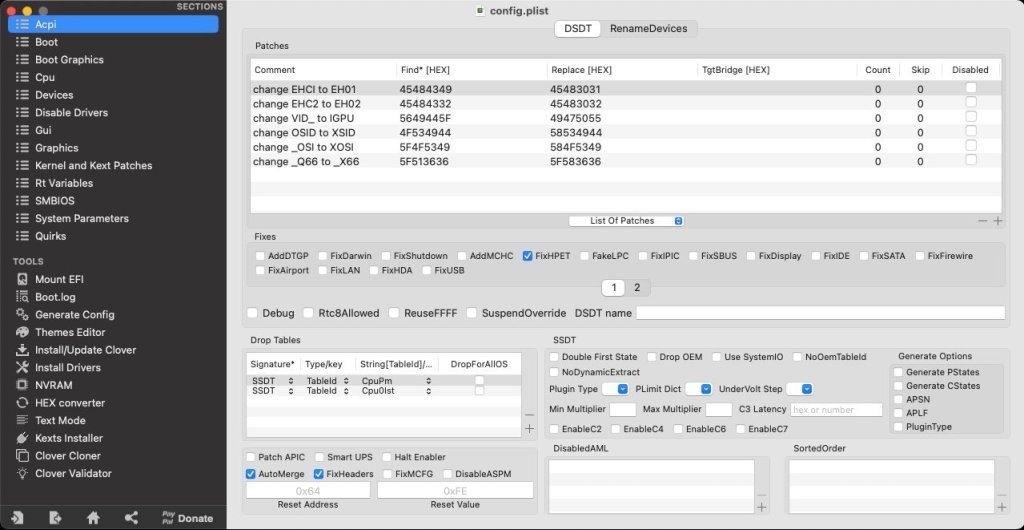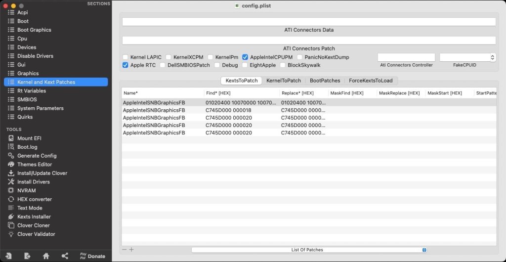 Re: UEFI, I did find out that it would not/coud not boot a USB installer with BIOS in UEFI mode but it certainly could boot macOS once installed. See the instructions for Mojave/Catalina of my E6220 guide for reference. In the end I could boot my E6220 in UEFI mode and without patched DSDT, just a very small set of patched SSDTs, 2 of them being to bring support for the screen brightness Fn keys (otherwise IMEI, PM and PNLF sufficed!). In the same respect, not may kexts were required (and forget about lspci one which was optional and only necessary for the lspci tool). There is no need to patch the kernel with Sandy bridge or Ivy bridge platforms like there was for Haswell and later platforms. All that is needed with regards to CFG lock is the AICPUPM patch. If you want to binary patch the kext yourself, do look at the specific thread that was posted on the matter many years ago. Of course, you need to generate the CPU PM SSDT that suits your own specific CPU model and, to that effect, you have to use the old ssdtPRGen script/tool that Pike R Alpha provided all those years ago. All I ever dropped in terms of SSDTswere the expected CpuPM + Cpu0Ist; 'never had to drop MCFG or whatever else... All in all, your writing style remains difficult to understand/decode and I think you're kind of all over the place so I suggest that, if you want further assistance, you post: 1) the hardware details of your E6520 (HD3000 only model or nVidia model?) 2) a zipped copy of your Clover/OpenCore EFI folder(s) (just include the config file, the ACPI folder and the kexts folder) You'll find details of the recommended BIOS settings for E6x20 laptops at the top of this very E6xxx forum section. I strongly recommend that you consult existing E6x20 installation guides. I went up to Catalina on my E6220 before I sold it off and it ran in UEFI mode. I explained how in the High Sierra instructions of my guide. You could also find my E6230 guide interesting for more recent versions of macOS (Big Sur and later). You want Monterey, ok (it's the last version to natively support Sandy bridge CPU PM) but why not stick with Clover if it works?