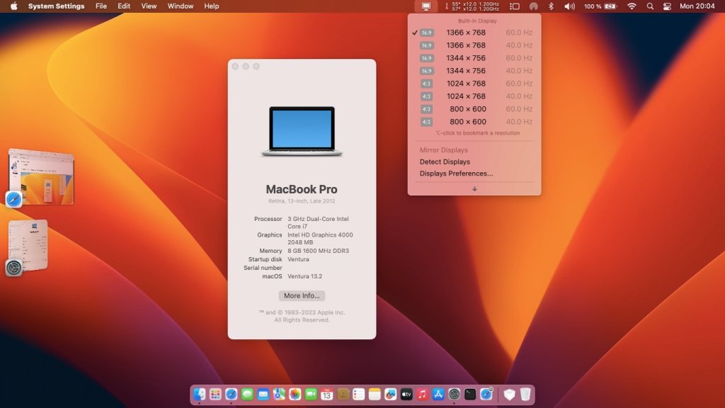 Target macOS release: Ventura 13.x. This is a Clover-based installation based on the standard vanilla method detailed below, followed by OCLP root patching to bring back support for HD4000 graphics. Working: full graphics acceleration on Intel HD4000 graphics (with Lilu v1.6.3 + WEG v1.6.3 + OCLP v0.6.1 root patching) multi-display with HDMI after OCLP patching audio, including jack microphone input and headset output (with AppleALC v1.7.8 & layout 12 + CodecCommander v2.7.2) HDMI audio (with Capri Framebuffer properties injection) built-in GigEthernet LAN connection (with AppleIntelE1000e v3.1.0 or latest IntelMausiEthernet kext) wireless and bluetooth with any compatible card integrated webcam (OOB) full CPU power management, including Turbo boost (with CPU-specific generated ssdt + AICPUPMClient v222.0 & patched AICPUPM v222.0 kexts) sleep (Lid, Energy Saver settings, Apple menu, Fn-F1, PWR button) & wake (Lid, PWR button) battery management (with ACPIBatteryManager v1.90.1) SD card reader (with DSDT patch or property injection, for compatibility with Apple's default card reader) keyboard (with Dr Hurt's VoodooPS2Controller R6 + DSDT patch for brightness control) touchpad including tap-to-click (with Dr Hurt's VoodooPS2Controller R6) left combo eSATA/USB2.0 + right USB3.0 ports (with Hackintool's generated USBPorts; optional FakePCIID kexts v1.3.15, published here, for multiplexing) ExpressCard slot OOB Stage Manager Continuity Camera Airplay Audio Not working: VGA output unsupported Not tested: SmartCard reader fingerprint scanner GeekBench v4.4.x (64bit) results: 1) 13.x USB installer creation Using a USB key of 16GB minimum, create a Ventura USB installer through the following Terminal command: sudo <path>/Install\ macOS\ Ventura.app/Contents/Resources/createinstallmedia --volume /Volumes/<USB key> where: <path> = location of Ventura installation package (eg: /Applications if freshly downloaded) <USB key> = name of formatted USB volume (eg: USB_16GB) The process will take several minutes. Once completed: install Clover boot loader on the USB installer with the following customised settings: Clover for UEFI booting only Install Clover in the ESP UEFI drivers Recommended Drivers (optional) EnglishDxe Human Interface Devices (optional) PS2MouseDxe USBMouseDxe FileSystem Drivers ApfsDriverLoader FAT (optional) Memory fix drivers OpenRuntime Additional Drivers (optional) PartitionDxe Themes (optional) BootLoader Chooser (optional) CloverConfigPlistValidator (optional) you may use version r5150 attached below Clover_r5150.pkg.zip once Clover is installed, launch Clover Configurator app and mount the freshly created EFI partition of the USB installer Clover Configurator.zip add the (unzipped) HFSPlus driver attached below to the EFI/CLOVER/drivers/UEFI folder HFSPlus.efi.zip open the EFI partition and transfer the files and folders from the Latitude E6230 Ventura Clover pack below to the EFI/CLOVER folder. The pack contains: the CryptexFixup + AMFIExemption kexts that are necessary to install Ventura on non-AVX 2.0 systems such as this Ivy Bridge platform the accompanying -crypt_force_avx and amfi_get_out_of_my_way=1 boot args AppleIntelCPUPowerManagementClient + patched AppleIntelCPUPowerManagement kexts (of Monterey origin) that are necessary for full Ivy Bridge CPU PM, Apple having dropped those in Ventura and XCPM not being achievable on this platform Clover_Pack_E6230_Ventura.zip /!\ If your E6230 is fitted with a different CPU than the i7-3540M, please remove the Power Management SSDT of the pack until you replace it by one applicable to your model (whether an existing SSDT or your own generated one) in the post-install phase. 2) 13.x installation boot the Ventura USB installer at the Clover main menu, go to the "Options->configs" menu and select the "config_MBP14,1" config file. This is required to install (and later update as/when required) Ventura on a supported Mac model. Press [ESC] twice to return to Clover main menu. at the Clover main menu, select the "Install macOS Ventura" partition and press [ENTER] at Ventura main installation screen, select Disk Utility to create & format APFS the target Ventura disk/partition/volume. Note that installation won't work if target disk/partition/volume is formatted HFS+ exit DU and return to Ventura main installation screen, then proceed with installation the installation process will need to reboot a temporary macOS Install from <target disk> partition to complete the installation. Make sure to select the "config_MBP14,1" config file before the reboot. repeat this until the temporary partition is replaced by a final <Ventura partition name> on Preboot entry. Each time, reboot via your USB installer and make sure to select the "config_MBP14,1" config file until you boot the partition labelled <Ventura partition name> on Preboot to finalise the installation. 3) Post-installation tuning Once the finalised Ventura installation has booted, complete the 1st boot configuration tuning. This will be very slow due to lack of graphics acceleration, HD4000 having been dropped since macOS Monterey. Once at the desktop, install Clover on your Ventura disk with above settings, then mount the EFI partition of that disk. Copy the contents of the E6230 Ventura Clover pack to the EFI/CLOVER folder of the mounted EFI partition. You may then modify your SMBIOS info using Clover Configurator app and ensure you have unique numbers or unique combination of numbers (MLB, ROM, SystemSerialNumber and SystemUUID). Please note that, with MBP10,2 SMBIOS, Ventura will not offer any updates because it'll be running on an unsupported platform. You'll only get updated offered if you boot with the MBP14,1 config file, MacBookPro14,1 being a supported model. Open up Terminal and type: sudo nvram boot-args="amfi_get_out_of_my_way=1" Download the latest version of OpenCore Legacy Patcher (OCLP) app (needs to be v0.6.1 minimum). Remove your USB installer and reboot (with defau