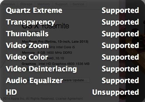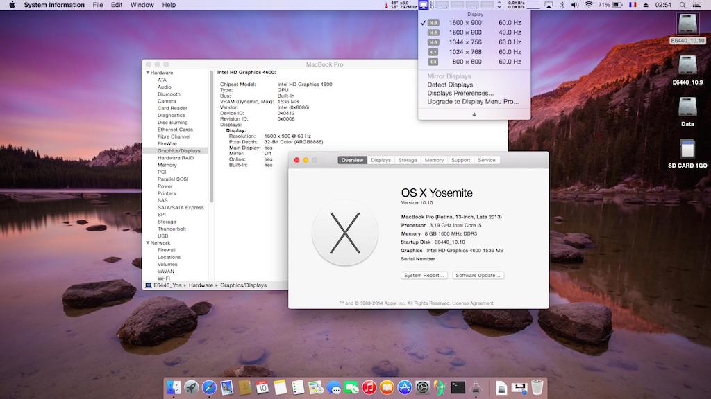 Moved on to Yosemite... Good news: everything that works under Mavericks also works under Yosemite. Installation process was the same one as I previously used for the D630n, i.e. manual USB installer creation + Clover boot loader: Mount InstallESD.dmg found in Install OS X Yosemite.app/Contents/SharedSupport Then mount BaseSystem.dmg (hidden file) open /Volumes/OS\ X\ Install\ ESD/BaseSystem.dmg Use Disk Utility to restore the contents of BaseSystem.dmg on a USB key (or HDD partition) formatted Mac OS extended (journaled). Remove link for Packages in folder System/Installation of your USB key rm /Volumes/OS\ X\ Base\ System\ 1/System/Installation/Packages Copy folder Packages located in InstallESD.dmg to folder System/Installation of your USB key cp -R /Volumes/OS\ X\ Install\ ESD/Packages /Volumes/OS\ X\ Base\ System\ 1/System/Installation Copy the 2 hidden files (BaseSystem.dmg & Basesystem.chunklist) of InstallESD.dmg to the root of your USB key cp /Volumes/OS\ X\ Install\ ESD/BaseSystem.* /Volumes/OS\ X\ Base\ System\ 1 | For those who want to use Clover as boot loader: Install Clover_v2k_r2695.zip (or later) to your USB key. Configure your config.plist to boot with option "kext-dev-mode=1" as follows: <key>Boot</key> <dict> <key>Arguments</key> <string>-v kext-dev-mode=1</string> </dict> * About option "kext-dev-mode=1": in Yosemite, "unsigned or malsigned" kexts will not be loaded. To use such kexts, the restriction can be lifted by adding option "kext-dev-mode=1" at boot phase. Copy all your kexts (FakeSMC.kext, etc.) to EFI/CLOVER/kexts/10.10 (consider this the "kext" boot pack). Grab kexts from the Mavericks boot pack. Copy the SSDT + Yosemite-specific DSDT to EFI/CLOVER/ACPI/patched E6440_HD4600_Yos10.10_DSDT.aml.zip Adjust Clover config.plist as required (you can use this file E6440_HD4600_Clover_config.plist.zip). Start your USB key. The OS X installer should then load. Proceed with installation as usual. The DSDT differs from the Mavericks version in the sense that it injects fake desktop HD4600 id 0x0412 to replace mobile HD4600 id 0x0416. The reason for this is that Apple did not include support for Mobile HD4600 in their Yosemite Azul framebuffer and AppleIntelHD5000Graphics kexts. In that same sense, those 2 kexts also require to be patched to add/inject the mobile HD4600 id 0x04168086 in the Info plist and binmod the kext binary file to replace desktop HD4600 id (86 80 12 04) by mobile HD4600 id (86 80 16 04). All this is quite extensively documented on the web and results from the work of several well-known Hackintoshers like Pike.R.Alpha or RehabMan and others... The following patched kexts should be copied to /S/L/E to replace the original ones (keep a backup somewhere). AppleIntelFramebufferAzul.kext.zip AppleIntelHD5000Graphics.kext.zip You may also do the same with the following patched kext in order to avoid the corrupt screen on Yosemite desktop initialisation. IOGraphicsFamily.kext.zip For those who wish to use Chameleon instead of Clover (you can safely use r2395 or r2401 and possibly above): copy the Haswell-patched kernel to be placed as is at Yosemite partition's root or in /S/L/K as "kernel" to replace the vanilla file (here again, keep a backup).Haswell-patched 10.10 kernel available here create /Extra folder with Yosemite-specific DSDT + SSDT + SMBIOS & boot plists using the following pack:E6440_i5-4300M_HD4600_Yos-Pack.zip E6440_i5-4300M_HD4600_Yos-Pack#2.zip E6440_i5-4300M_HD4600_Yos-Pack#3.zip E6440_i5-4300M_HD4600_Yos-Pack#4.zip E6440_i5-4300M_HD4600_Yos-Pack#5.zip copy the Yosemite pack kexts to /S/L/E, replacing any vanilla kext (keep a backup beforehand); alternatively, copy kexts to /L/E open Terminal and rebuild permissions and cache with commands sudo chmod -R 755 /S*/L*/E* + sudo chown -R 0:0 /S*/L*/E* + sudo touch /S*/L*/E* + sudo kextcache -Boot -U / (replace /S*L/*E* by /L*/E* if you copied kexts to /L/E) With Chameleon, it's critical to rebuild the cache with above 4 commands or the installation will become unbootable. Chameleon cannot boot Yosemite without cache! As such, bear that in mind any time you add or modify kexts in Yosemite. Remember to set hibernate mode to 0 (zero) and to remove /var/vm/sleepimage. The system requires additional tuning so additional posts will follow in due course. Again, other E6440 laptops fitted with same graphics hardware config (GPU + LCD) but different CPUs will require a different SSDT table than provided in the above pack (can be looked up on the web or created with SSDT generator tool -> See RampageDev's blog for detailed guide). In such cases and in order to avoid CPU power management-related kernel panics (KP), NullCPUPowerManagement kext is recommended until the CPU-specific SSDT is generated. The kext just needs to be added to /Extra/Extensions or /S/L/E.