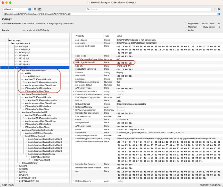 This IOReg shows you're faking iGPU id 0x5917 so it's never going to work... If you have another macOS system, you could try to access this Surface Book 2 remotely but you'd have to setup screen sharing to begin with. You can do that when you boot with one of those invalid ids. You may need to inject your screen EDID if screen goes black when graphics initialize. -