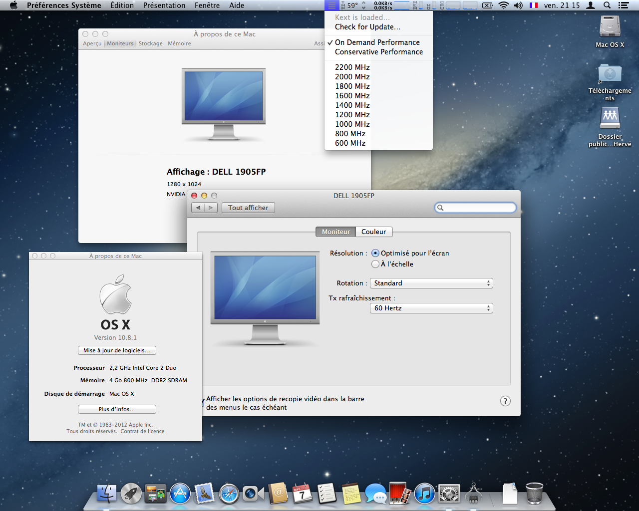 I envy those readings. On my D630 nVidia, CPU T° is in the mid-60s to high-70s range most of the time. It idles around 58°C. I should reactivate my Coolbook license (mislaid many moons ago) and try to undervolt the CPU like I do under Windows. This is the sort of things I run the D630 GMA on and it peaks in the low 60s (idles around 38-39°C): Under Mac OS the CPU voltage is between 1.12V (@600Mhz) and 1.36V (@2.2GHz). Quite a difference...