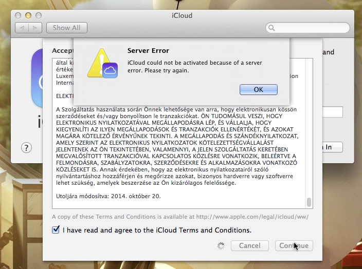 Hi! After a serious fault, i reinstalled my system, and i made a guide about how to fix the iCloud. aaand it's worked. more or less. I checked it with my friend's apple id, who has a real Mac and iPad. I was able to log in without problem. I checked it with app store and iCloud. But when i tried to log in with my apple id (what i never used before, because last time i could't make to work the app store and the iCloud) i ran into the following problem. When i log in to the app store, there is no problem (still i didn't attached my credit card to the id, so i can't look around the downloading until i make that). however when i try to log in to iCloud in system preferences, it throws me back like this way: Try to log in - it shows me the Terms & Conditions text - when i check the read box and to the continue, it disappears but after 1-2 sec it comes back.. over and over and over. The only difference what i noticed is that when i check the box AND i roll down the text until the and, and after click to the continue it shows an error message* for a 1/2 sec. And everything start again. First i thought the problem is that i don't have any iOS device, but when i noticed this message my theory was weakened. I made a video about it and take a screen shot in it to show the message because there is no human who can make a screenshot about it in that short time (i think ) Could anybody suggest me anything to solve this? Thanks!