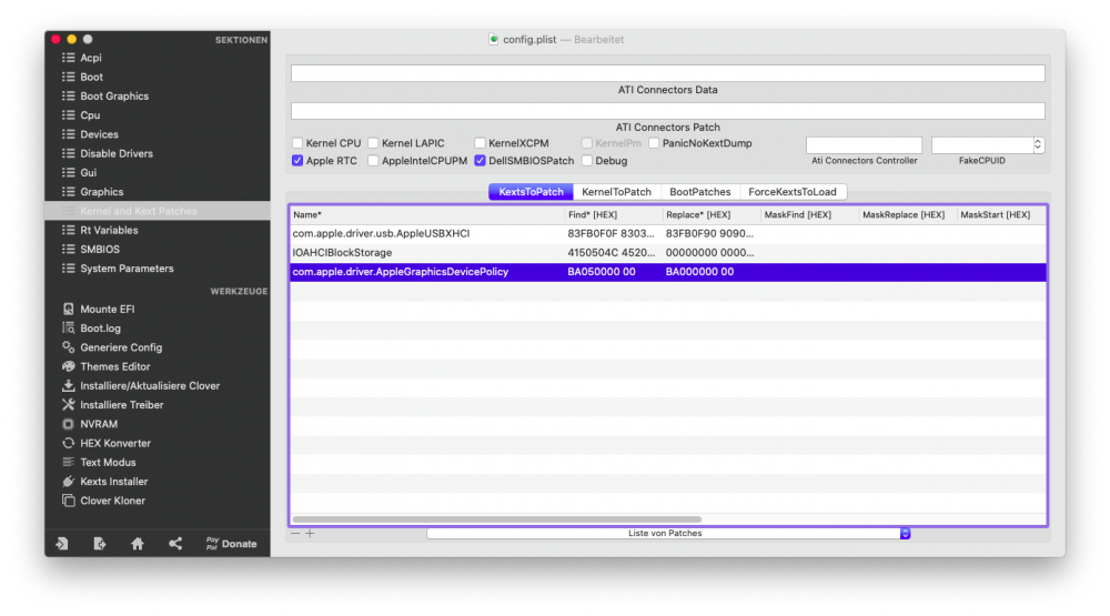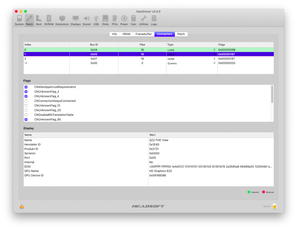 Hallo got it did some test, in another forum there was the hint to prevent AGDP from loading : Name: com.apple.driver.AppleGraphicsDevicePolicy Search: BA050000 00 Replace: BA000000 00 Comment: prevent AGDP from loading and that did it for me Hot plug is working too only HDMI audio is not there (need some tests, pachting ) and there no Sync-options in Menu-bar config1.plist.zip