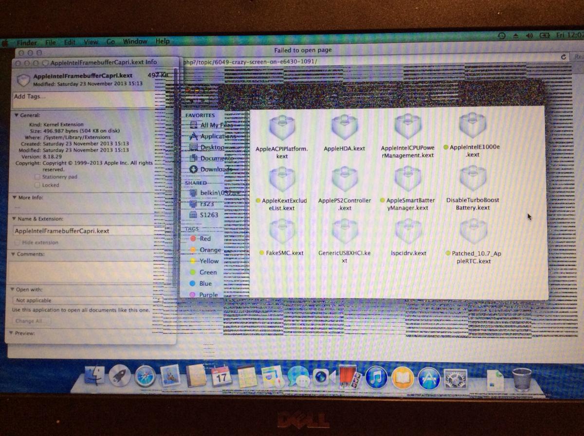 Wel, since I do not have the original kext anymore (so far for backup) I took your advise and remove the kext file from the E/E folder, ran myfix with the quick option and finally rebooted (with the patched for 10.9.0 kext in S/L/E). A slight diff but the disturbing bars are all over the screen but more on a on/off cyclic thing and reacting on every keystroke or mouse move. Sometimes it stays clean for a little while, flashes than to a screen will a lot of bars and after while switches back to a normal screen etc. etc. This text I typed with the on-board keyboard, using the mouse pad sometimes and used the LAN connector to get to the internet. Just working .... even my NAS (synology) based iTunes server was listed immediately as nasTunes and avail for all the media on it. Playing just fine, audio hearing good. Do not know what quality though got quite a collection of hires aac files a full TB in the range from 48 kbps - 192 kbps .... still testing ... but first need to get that nagging screen working .... so if you got a default AppleIntelFramebufferCapri.kext for an e6430 w/ hd4000 at the above mentioned resolution would be just grand !!!!