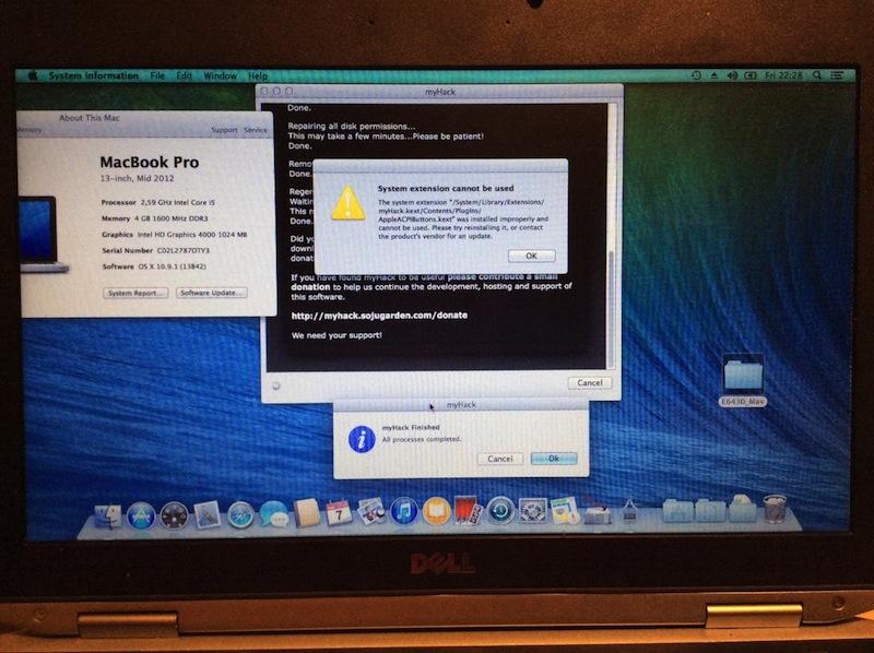 And again, the story continues .... All this is typed in from the E6430 now on Mav 10.9.1 with latest updates .... As said before, installed your zip file on top of the boot usb made. Bootet from that USB and ran through the install process without any screen disturbances whatsoever. Just went perfect, just forgot to delete on the first prompt after selecting the extra from the boot usb when asked by myHack. Something about AppleACPIButtons or something .... selected to delete the nvidia stuff since I do not have that at all. Waited for the reboot to happen. Now the fun starts: Got the message that the boot partition was not valid .... after just hitting enter just ignored that and bootet Grey screen with boot options timeout etc. nothing done, continued booting Now the screen artefacts are back while completing the install .... After completion .... re-applied your zip file with my hack but no change ... Typing in this text I noticed that at every keystroke the screen flashes those artefacts ... What I noticed as well, the enter key is kind of slow .... and the home and end key don't work as are ctrl-c, ctrl-v for copy and paste, they don't work either. What I found out as well is that my E6430 LCD Display is an LVDS and not an eDP type. Do not know if that is relevant though. And for the good, sometimes for a second or two the screen is OK but just for those two seconds and then the artefacts are coming back more or less with a kind of heart beat so pulsing in frequency, sometimes slow sometimes faster ... external keyboard gives same behaviour as external mouse as well. Maybe I should find that AppleACPIButtons*.* Any advise is welcome .... we are almost there .... I hope ....