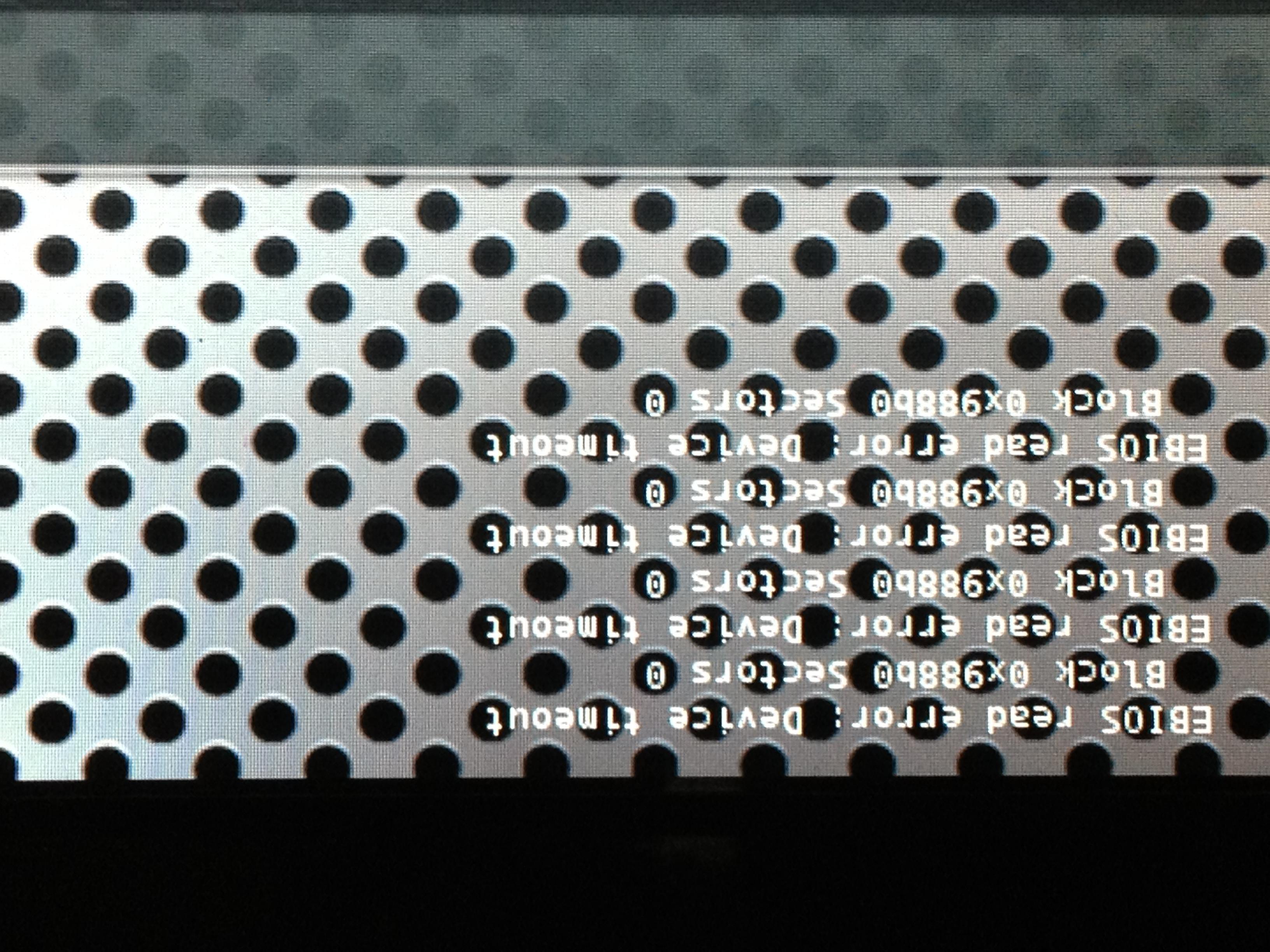 Thanks JawhnL5 for this idea. I hadn't even thought of this. So after spending the whole day trying to get VMware working I finally managed to get it up and running and build the USB using myHack. I followed the instructions from the thread that's pinned above this one. Now I have run into more trouble. The USB stick is now booting on the D630. The read light on the stick then shuts off and it hangs for ages before changing to the apple logo with the loading circle under it. It then hangs at this screen forever. No error messages show up. I tried booting it from my other laptop (Aspire 5930G) and I get the same thing but it shows "EBIOS read error: Device timeout" as you can see in the picture. Please tell me this is something that's easy to fix? I'm beginning to wonder if it's worth all this trouble...