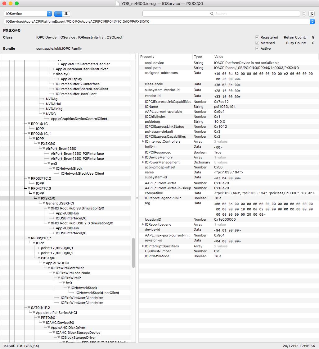 I found some progress with USB 3.0 (pci1033,194) In 10.10 Yosemite I used GenericUSBXHCI.kext to work USB 3.0 and in YOS_m4600.ioreg file I found this USB 3.0 port under RP04 section. (PXSX@0) So, RP04 section is also under 10.11 El Capitan, but there are no other informations. (ELC_m4600.ioreg) I think, that GenericUSBXHCI or AppleUBSXHCI must be edited to load properly. IOREG.zip