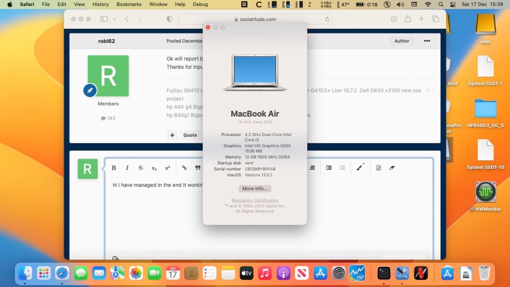 hi guys I have installed ventura no my hp and I read that you need to patch with oc 051 in order for card to work. so I downloaded oc legacy and did that but now when I boot when I reach desktop it stays black....while before it booted with 3mb in the intel hd5500. I tried in putting a few config but results is the same???? Any idea which one will do the trick??? I attach a screenshot on my card id