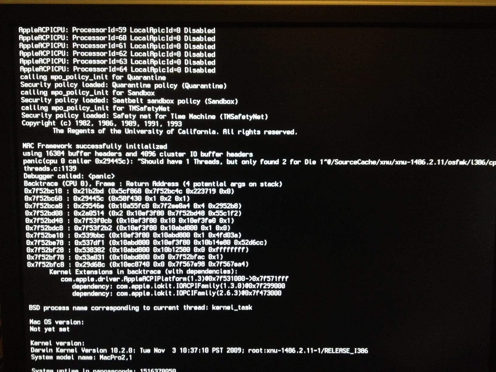 Still no luck with booting the 2cpu rig, panic during boot with a swift reboot. No chance to take a pic of the panic-error-message, but managed to film it with my FlipCam and snipped some screenshots from it(sorry for the bad quality)