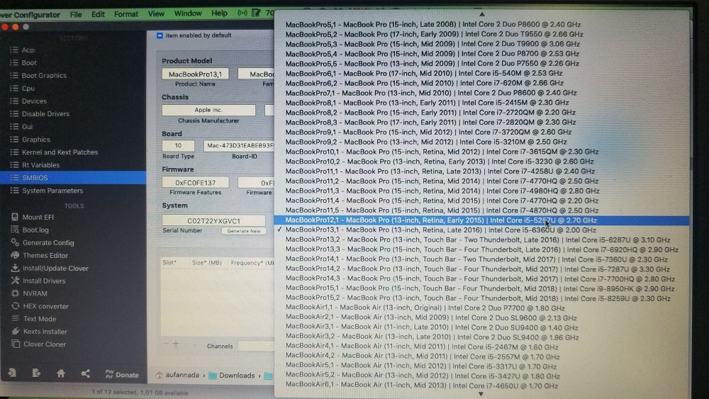 Then I change the SMBIOS in config.plist by selecting type 12.1 (as shown in the picture) and after that the USB installer can run. But then it stops as seen in the picture.