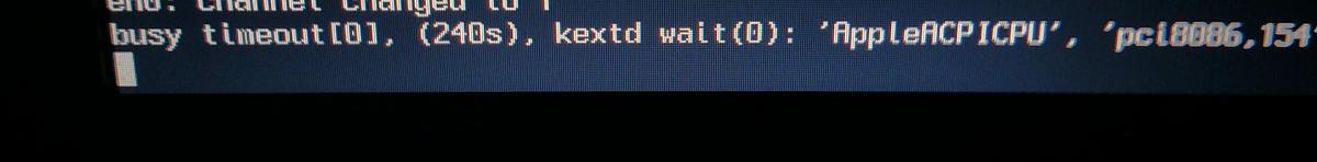 Yeah I don't know why it blocks downgrades, but it does. Anyway I've booted it in verbose mode and I've identified the issue (I think). It has something to do with that last command "busy timeout[0], (240s), kextd wait(0): 'AppleACPICPU'". After another 10 minutes, instead of a garbled mess, I get the proper apple logo with the spinning ball. But that's as far it will go -