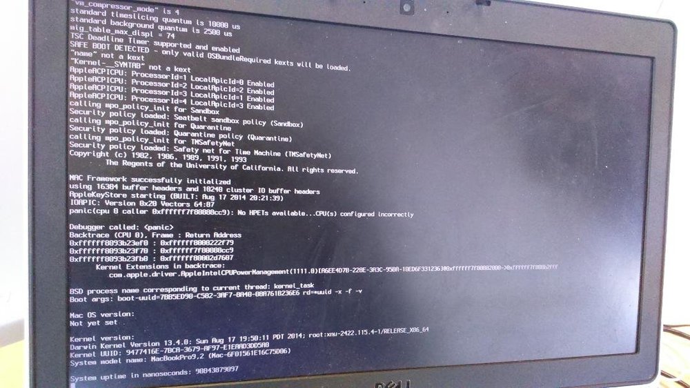 Hi all, If anyone can help with this, that would be great. I am running OS 10.9.3 on a Dell E6530. It is becoming unstable, so I am attempting to wipe and reinstall. I have created an installer USB using this method: The version of OSX i have loaded onto the installer USB is 10.9.5. However, when I start up from the USB, it hangs. See the screenshot, attached. If anyone can help, that would be great. Thanks v much, John. System Model: Latitude E6530 System Type: x64-based PC Processor: Intel® Core™ i5-3320M CPU @ 2.60GHz, 2601 Mhz, 2 Core(s), 4 Logical Processor(s) Processor ID: 306a9 Intel HD graphics 4000 BIOS Version/Date: Dell Inc. A09, 13/12/2012 SMBIOS Version: 2.7 Installed Physical Memory (RAM): 4.00 GB