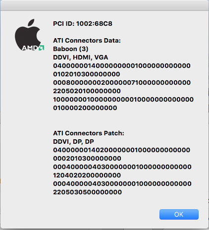 you can try amdframebuffer utility you have to download the source code. the compiled app is inside the folder. if your using clover you can dump your video rom as you will need it to use that app. press the F1 key for information on what F key dumps the video rom. it will be located in clove misc folder with a bin extension. amdframebuffer utility app should show what FB to try and allow you to change connectors I think it auto detect your ports configuration for you. the second screen shot is the patch info that you can use to add to clover. also DPCIManager app might give you a clue to what kexts to look at to spoof one of the device id's that closest match yours and you can also use to fake the device with the id in clover device/fakeid section click on the magnifying glass next to your graphics device on the left to see what kexts it suggests not all suggestions are apple kexts so don't look for those some are third party suggestions. im also having no acceleration issue on a Dell Precision T7500 workstation on high Sierra but I also tried Sierra and maverick . In my case my machine is bios only and I have clover installed as legacy. clover is not injecting anything I put in config regarding device injection or graphics injection. I had to manually add my device id's to amdlegacysupport.kext and amd5000controller.kext but the FB above is not loading but I do get resolution options and it now shows 1gb gram instead of the 8mb it was showing before manually editing the kexts plist with my id's if you have uefi bios maybe the stuff I posted might work for you in clover. if your on bios I welcome you as I have room for 1 more on my boat http://www.insanelymac.com/forum/topic/284656-clover-general-discussion/?p=2533052