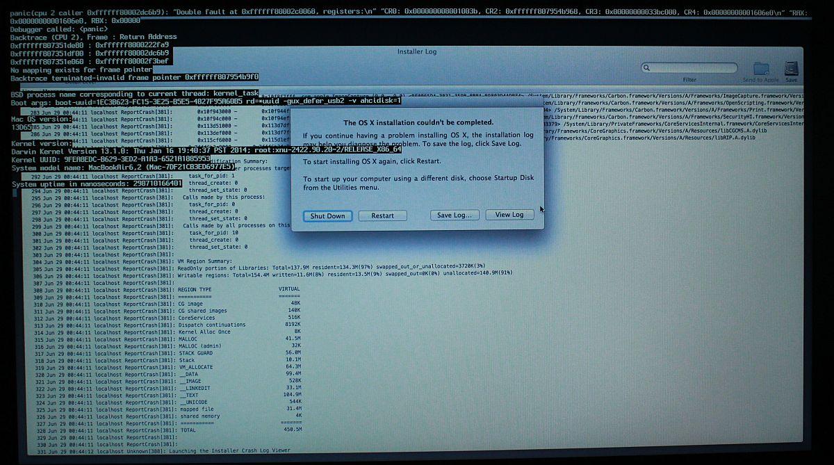 With default MacOSX (myHack or any other boot loader) I can't get into setup screen (just reboots due to Haswell CPU), I've found bootpack for E5440 and I've changed CPU from i7 to i5 (found on forum), now Dell start up to setup screen (with DVD removed and only from hard drive) but when I want to install OS I got "The OS X installation couldn't be completed" and along with it panic(CPU 2 caller).