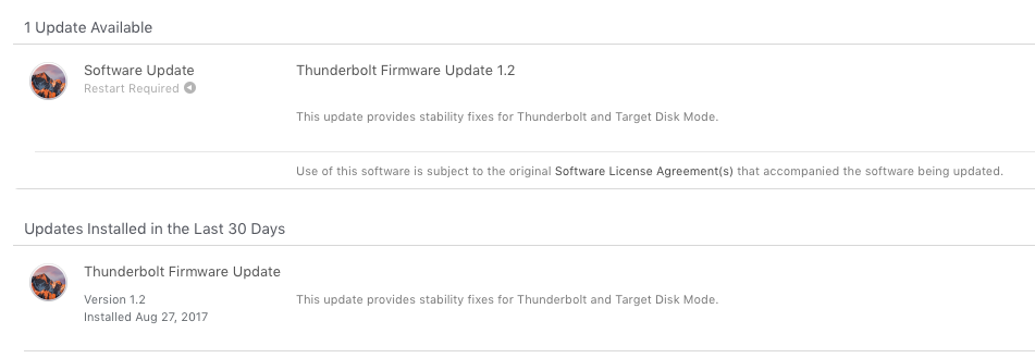Meanwhile I installed Sierra on the internal SSD (not USB) but still get the same KP error message when booting and another window pops up saying there was a problem. sudo find / -name *oodoo*.kext -print 2>/dev/null When I execute the above stated code in the terminal I get some results. It returns for instance: /EFI-Backups/r4035/2017-08-27-02h51/EFI/CLOVER/kexts/Other/VoodooPS2Controller.kext /EFI-Backups/r4035/2017-08-27-02h51/EFI/CLOVER/kexts/Other/VoodooPS2Controller.kext/Contents/PlugIns/VoodooPS2Keyboard.kext /EFI-Backups/r4035/2017-08-27-02h51/EFI/CLOVER/kexts/Other/VoodooPS2Controller.kext/Contents/PlugIns/VoodooPS2Trackpad.kext A few other hits are located in my user folders where I store all my various documents. Could these .kexts located there be loaded by the system or the Clover Loader? Also, not sure if this is linked to my initial problem I noticed that the update for Thunderbolt does not get installed properly as the App Store keeps asking to install it again and again. See screenshot from the App Store Update section below. Thanks a lot for your help! -