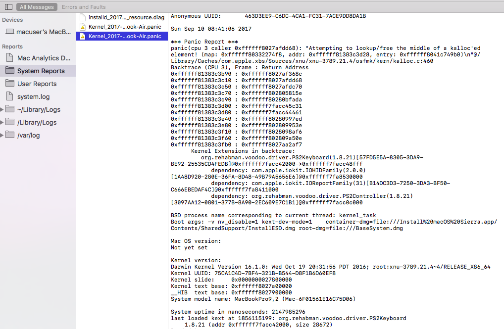 Hey Guys, today I re-created the Install USB Drive for Sierra from scratch again and made a clean install using the EFI files for my 6430u 1600x900 IntelHD that I found in this forum under Clover Guide. The installation ran through smoothly, without any issues or messages. After the very first login (after setting up a user) I checked the console and found the same KP under System Reports. I mean I did not do any post-install actions yet, no other kexts were copied from anywhere, just the files and kexts that are provided along with the Clover Guide for my system. Any idea? Anybody out there running Sierra on 6430u without any KernelPanic report in the System Reports? Thanks for your help! -