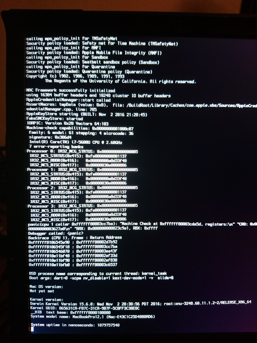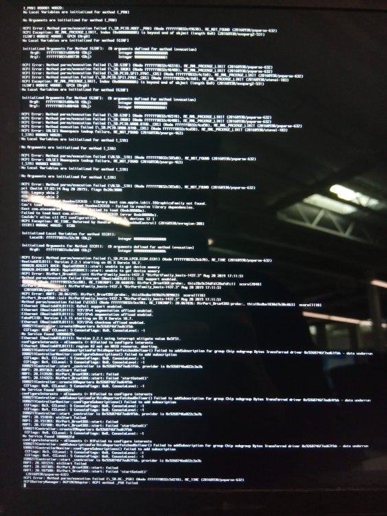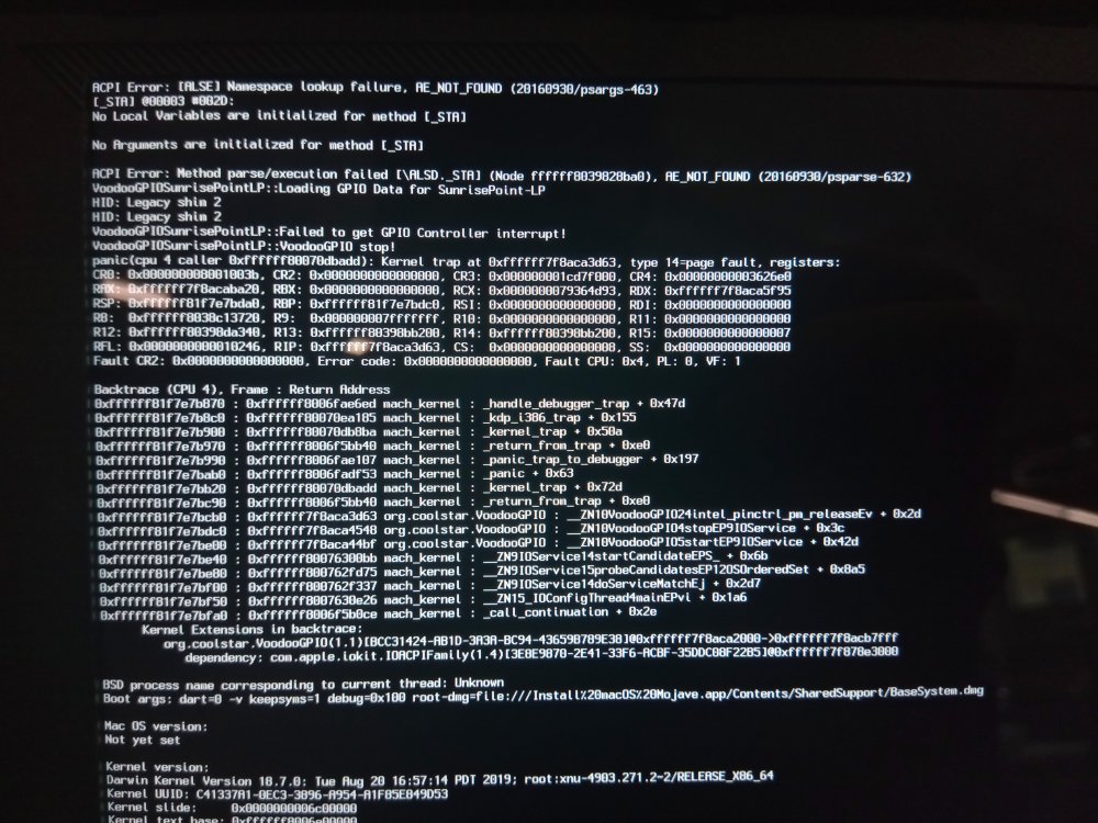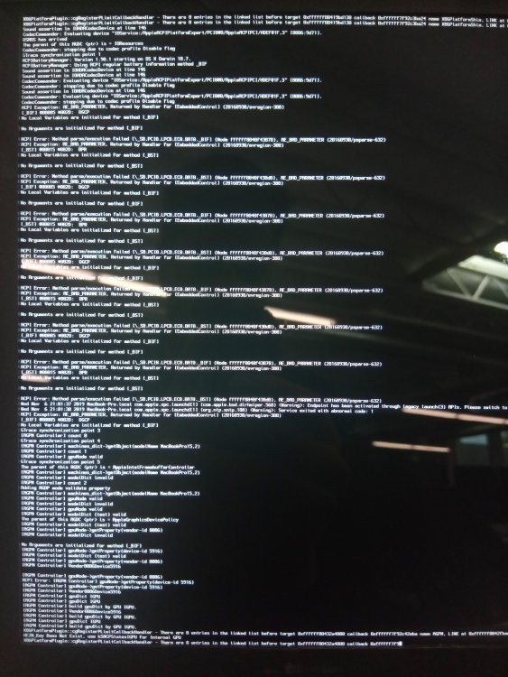 Hi- Tried it, no luck. I think there a still ACPI errors (they scroll by too fast for me to tell), but the thing that now gives a KP is: VoodooGPIOSunrisePointLP: Failed to get GPIO Controller Interrupt As far as I can tell. Screenshot attached, sorry if it's small. This is a 3K screen in a 12" laptop... R EDIT: If I run it with single user & safe mode, it stops here: -